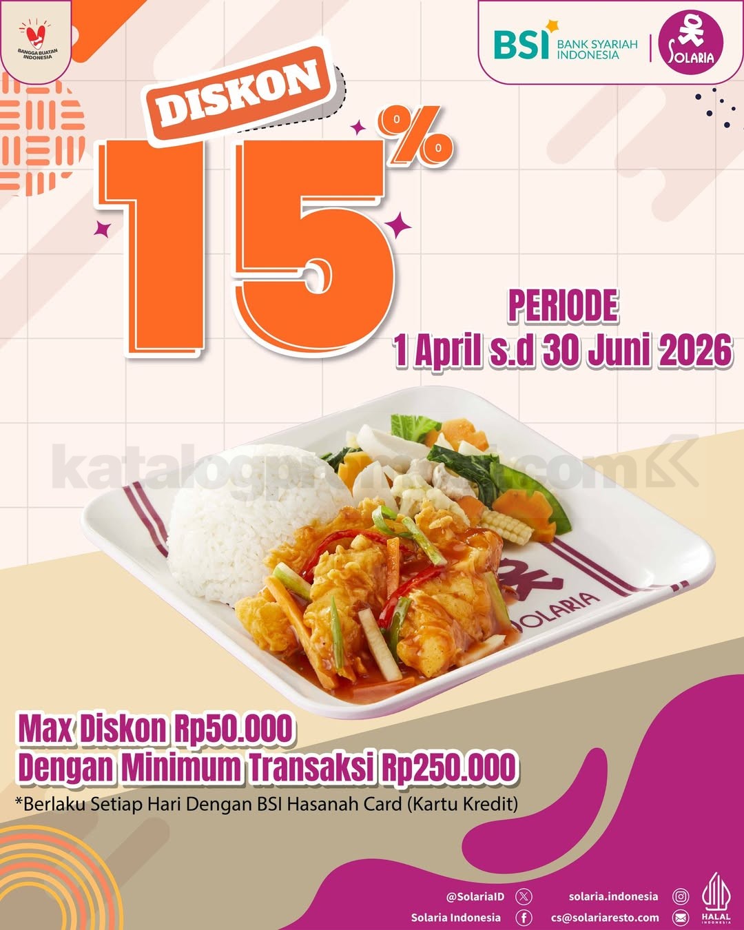 Promo Solaria BSI Hasanah Diskon 15% maksimal Rp. 50.000 bayar pakai kartu BSI Hasanah berlaku 1 April 2026 – 30 Juni 2026 di seluruh outlet