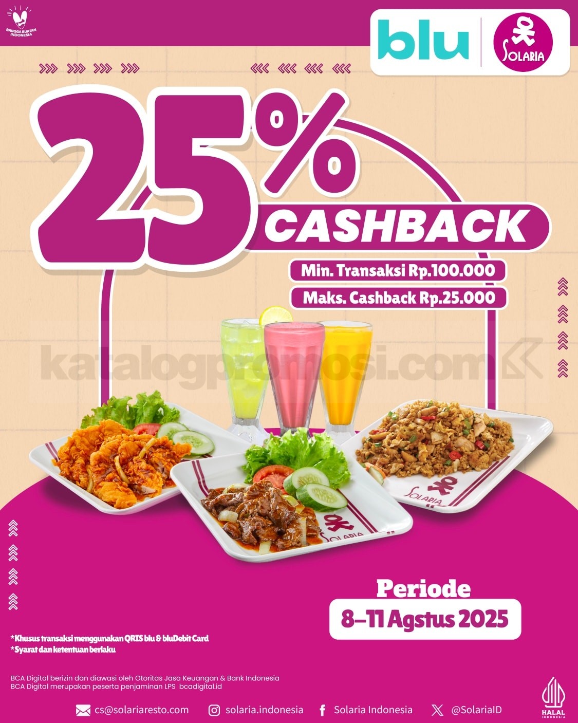 Promo Solaria Cashback 25% QRIS blu berlaku 8–11 Agustus 2025, nikmati makan siang hemat bareng teman dengan minimal transaksi Rp100.000