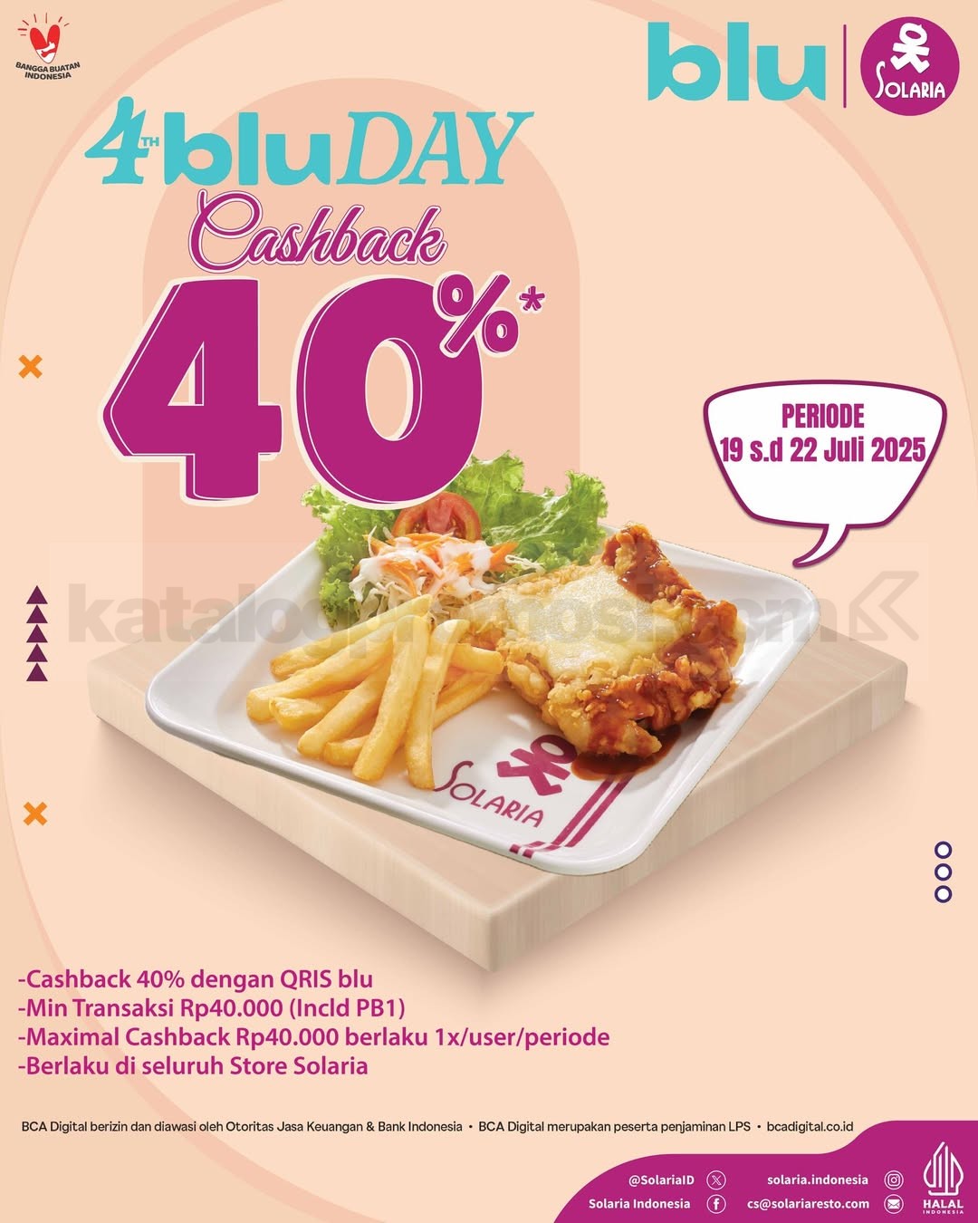 Cukup bayar pakai QRIS blu atau bluDebit Card BCA di semua outlet Solaria, dan nikmati cashback 50% hingga maksimal Rp. 50.000 per user per periode. Minimal transaksi hanya Rp. 100.000, berlaku hingga 31 Desember 2025, tapi kuota terbatas, jadi pastikan kamu gercep sebelum promo habis!