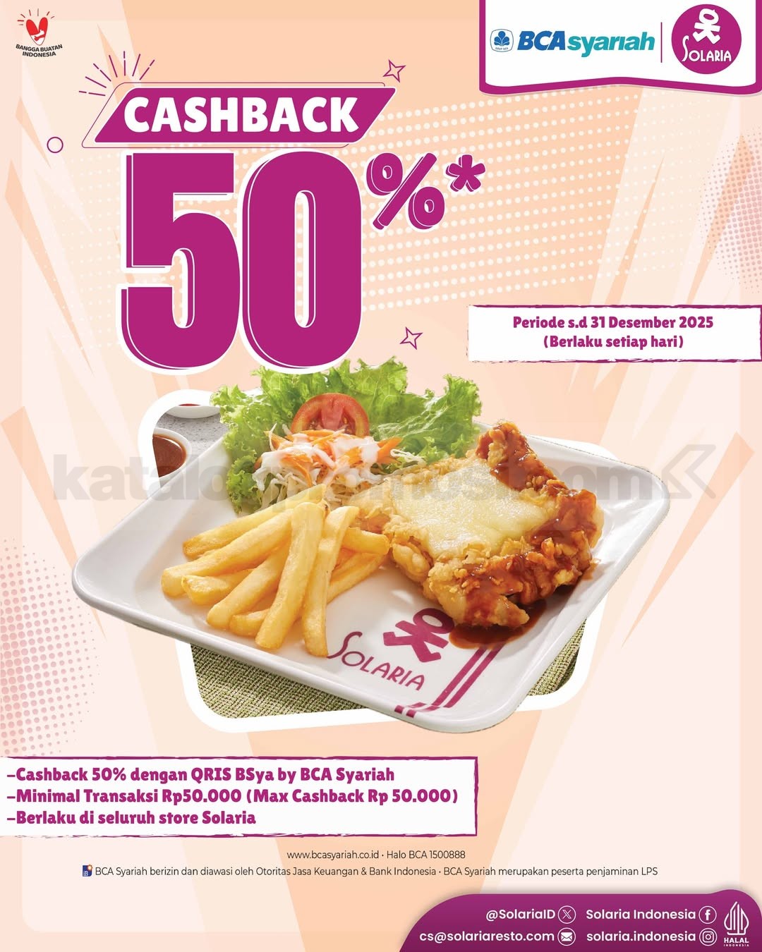 Promo Solaria Cashback 50% QRIS BSya by BCA Syariah berikan potongan hingga Rp. 50.000 untuk transaksi minimal Rp. 50.000, berlaku sampai 31 Desember 2025.