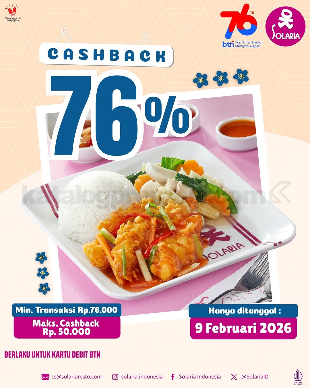 Promo Solaria Cashback Debit BTN 76% potongan hingga Rp. 50.000 dengan min transaksi Rp. 76.000 berlaku 9 Februari 2026 di seluruh outlet