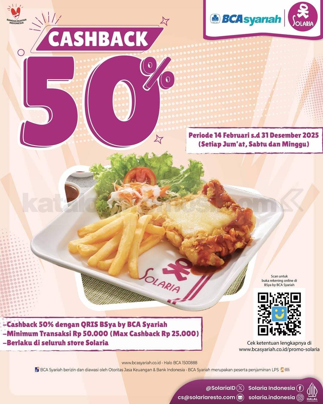 Promo Solaria cashback 50% pakai QRIS BSya by BCA Syariah berlaku setiap Jumat-Minggu sampai 31 Desember 2025.