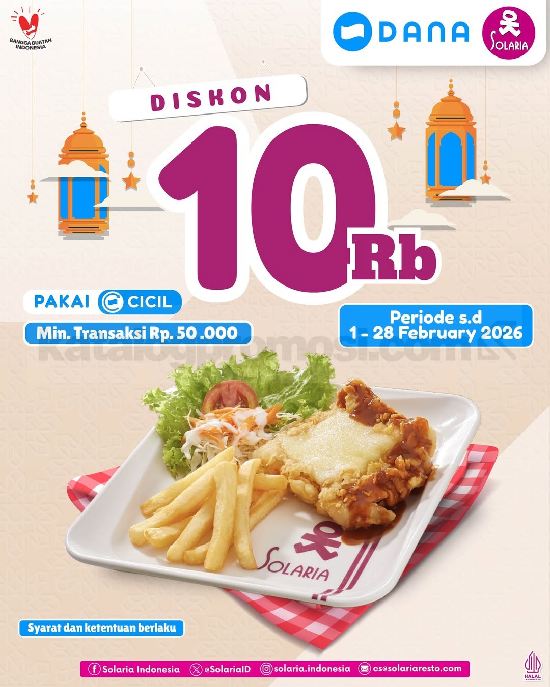 Promo Solaria DANA Cicil Diskon Rp. 10.000 potongan transaksi bayar pakai DANA Cicil minimal transaksi Rp. 50.000 berlaku 1 Februari 2026 – 28 Februari 2026 di seluruh outlet