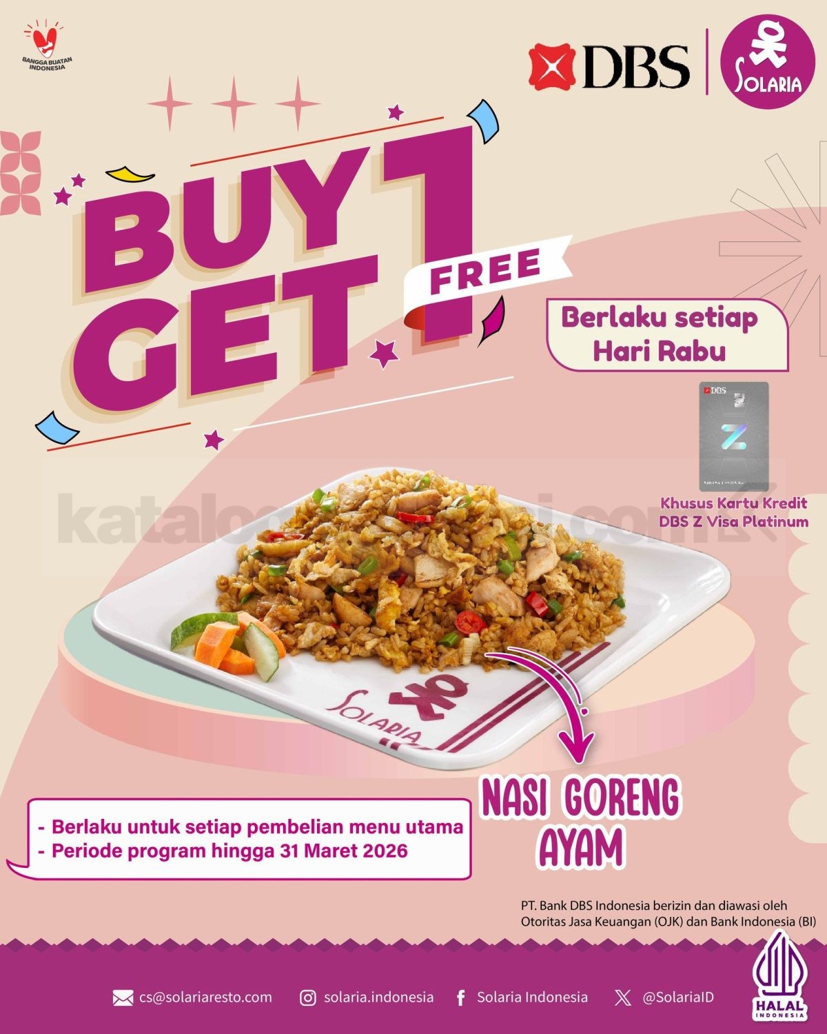 Promo Solaria DBS Beli 1 Gratis 1 Nasi Goreng Ayam beli 1 makanan gratis 1 menu dengan kartu Digibank Z Platinum berlaku hingga 31 Maret 2026.