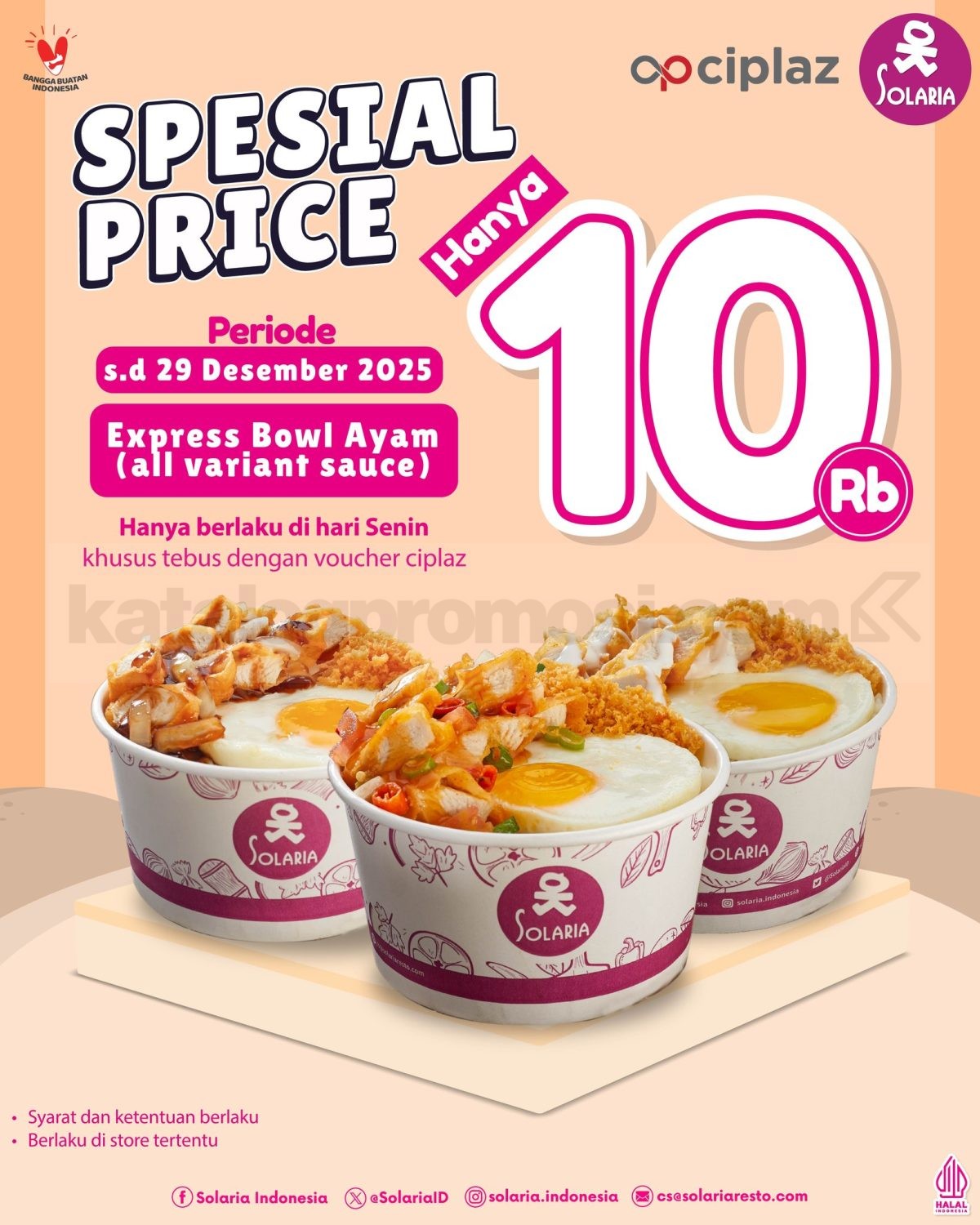 Promo Solaria Express Bowl Ayam semua varian cuma Rp. 10.000 dengan tukar struk belanja di CS Mall, berlaku setiap Senin s.d 29 Desember 2025 di lokasi tertentu.