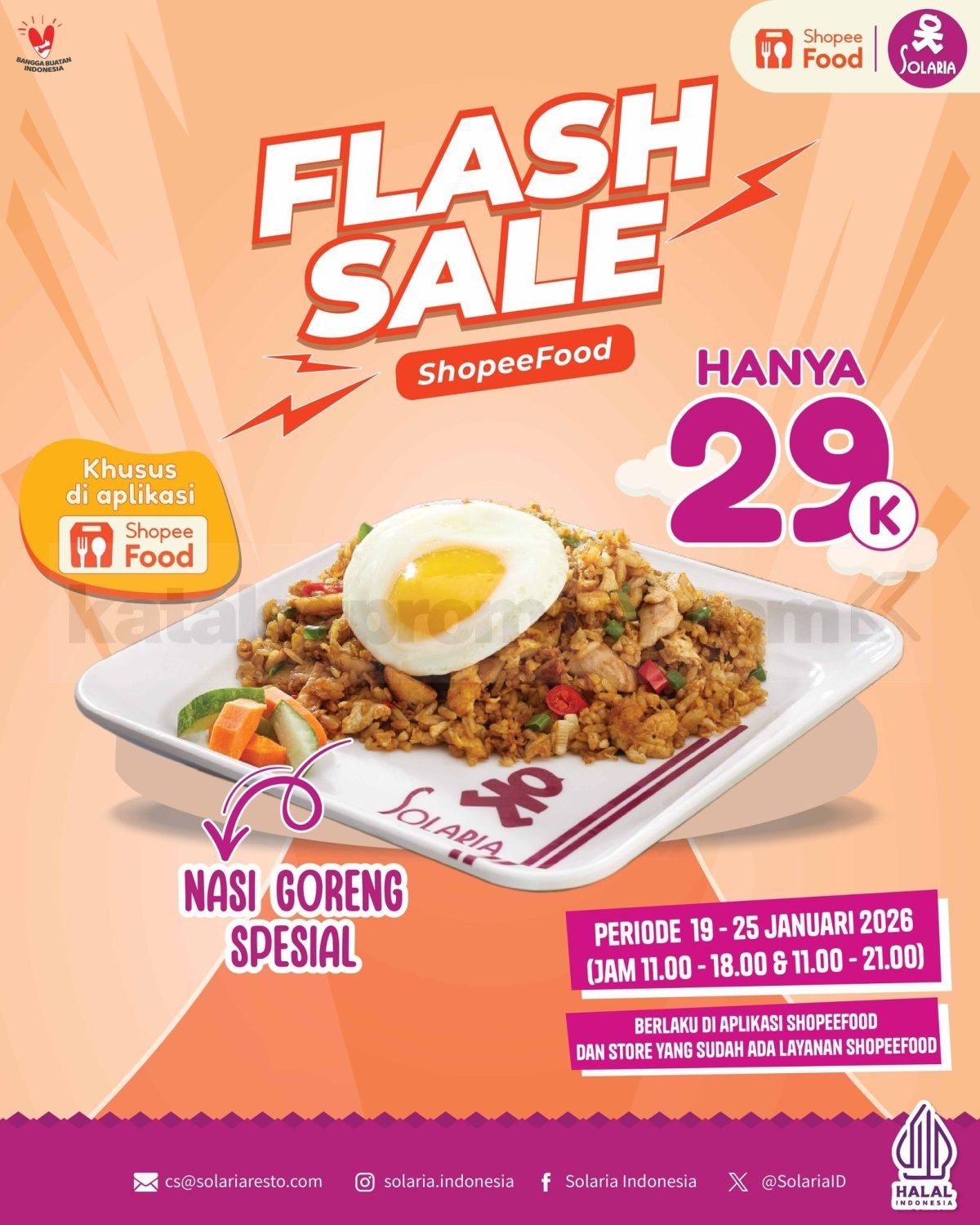 Promo Solaria Flash Sale ShopeeFood Nasi Goreng Spesial Rp. 29.000 lewat aplikasi ShopeeFood dengan jam terbatas, berlaku mulai 19 Januari 2026 – 25 Januari 2026.