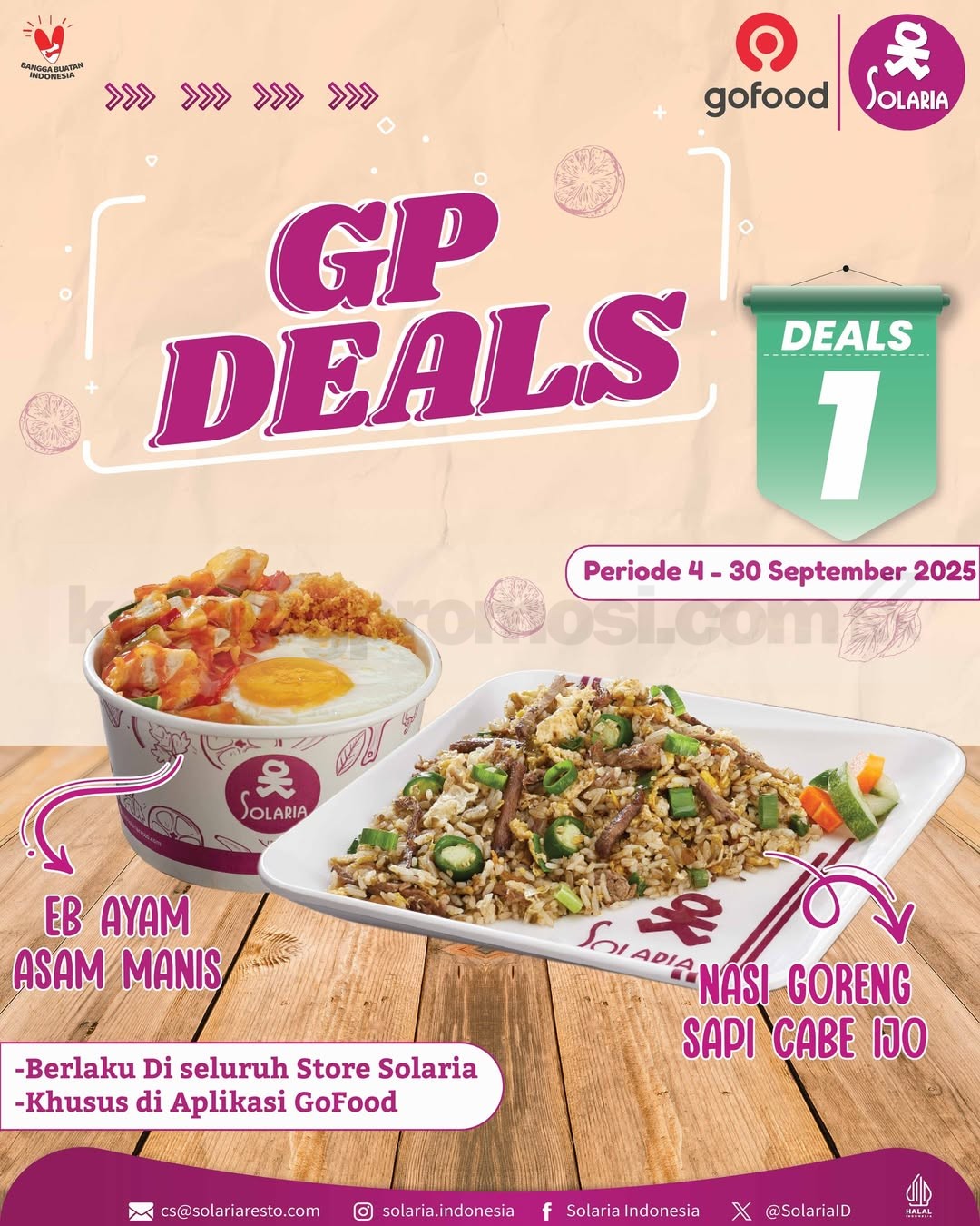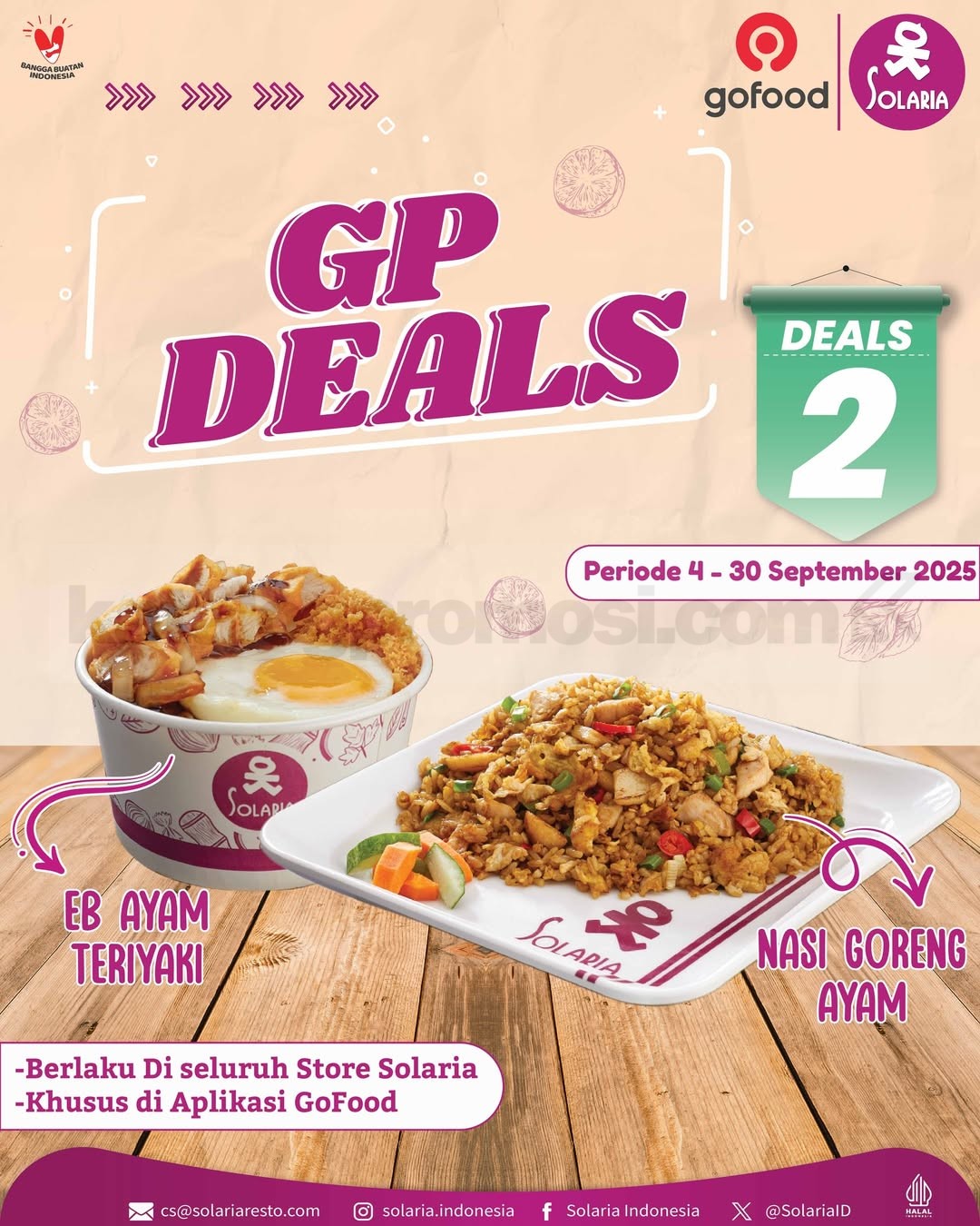 Promo Solaria GoFood Paket GP Deals berlaku mulai 04 – 30 September 2025. Pilihan paket hemat untuk berdua dengan menu favorit