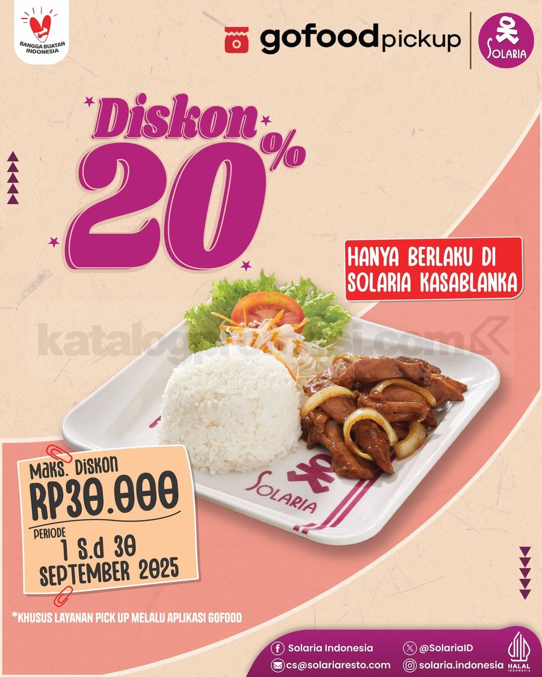 Promo Solaria Diskon 20% di Kota Kasablanka! Pesan via GoFood Pickup, nikmati semua menu favorit lebih hemat hingga 30 September 2025.