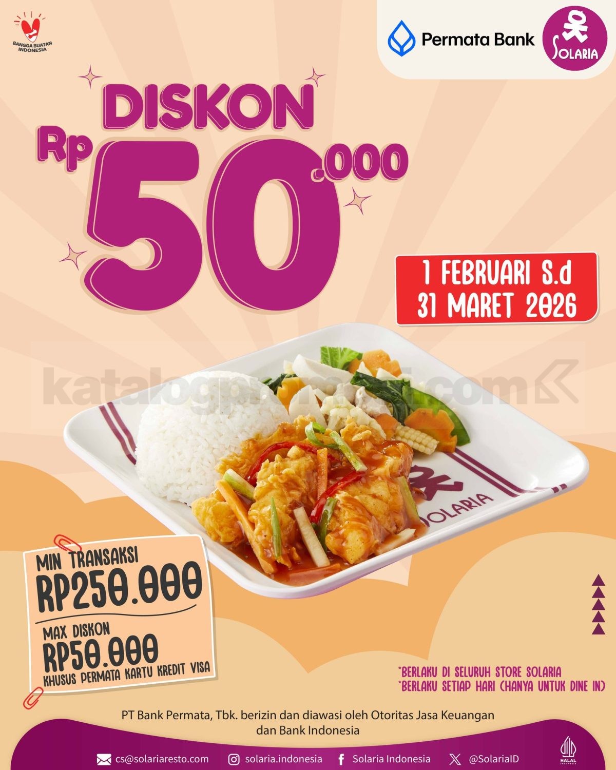 Promo Solaria Permata Bank Diskon Rp. 50.000 hemat dine in dengan minimal transaksi Rp. 250.000 berlaku 1 Februari 2026 – 31 Maret 2026 di seluruh outlet.