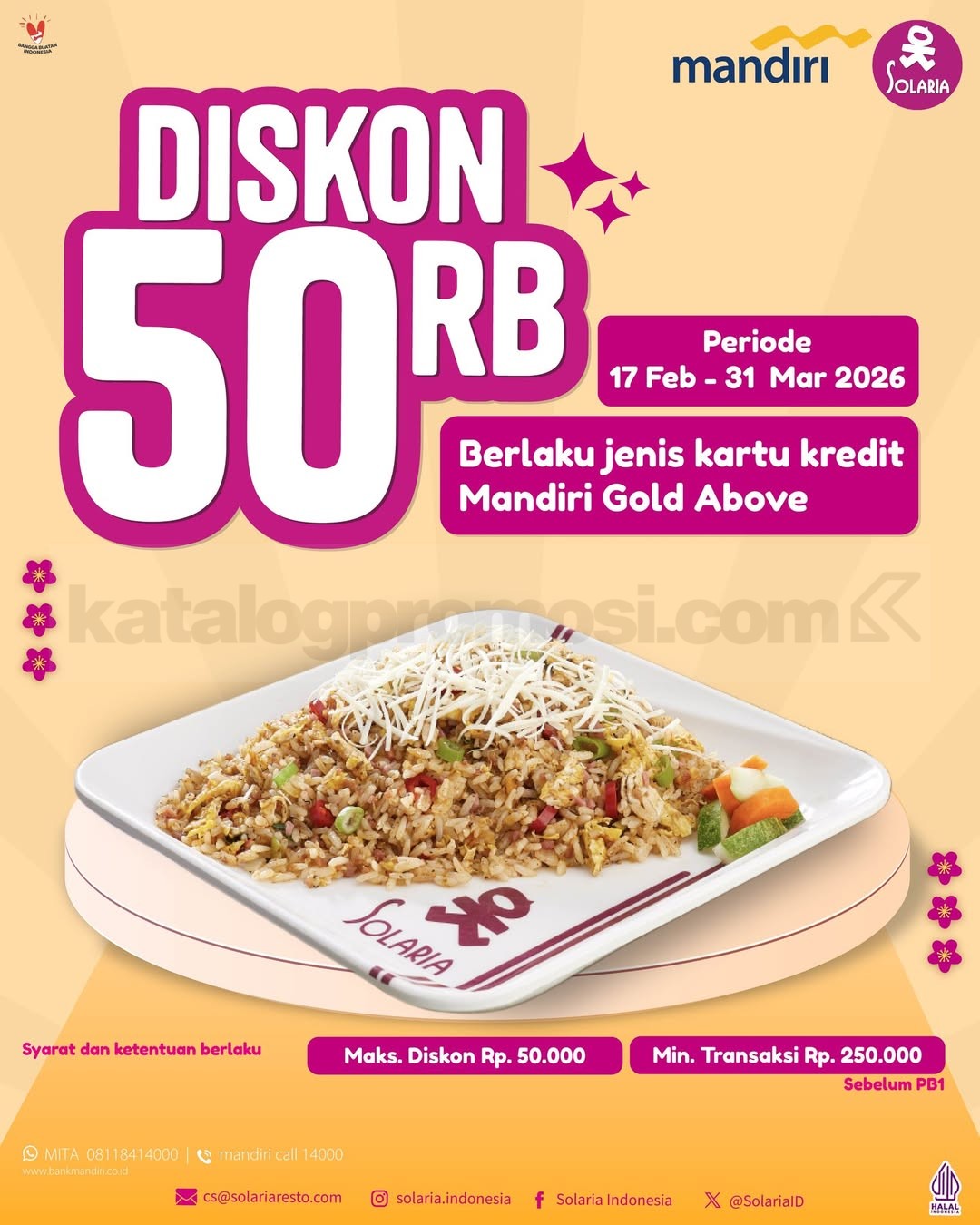 Promo Solaria Spesial Mandiri Diskon Rp. 50.000 hemat makan min transaksi Rp. 250.000 berlaku mulai tanggal 17 Februari 2026 – 31 Maret 2026