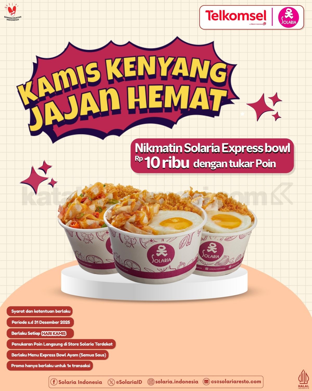 Kabar gembira buat yang nunggu-nunggu Kamis Kenyang Jajan Hemat! Mulai sekarang, tiap hari Kamis kamu bisa nikmatin Express Bowl Ayam di Solaria cuma Rp10.000 aja πβ¨ Cukup tukar Telkomsel POIN kamu, scan QR di store, dan boomβjajan hemat langsung jadi kenyataan!