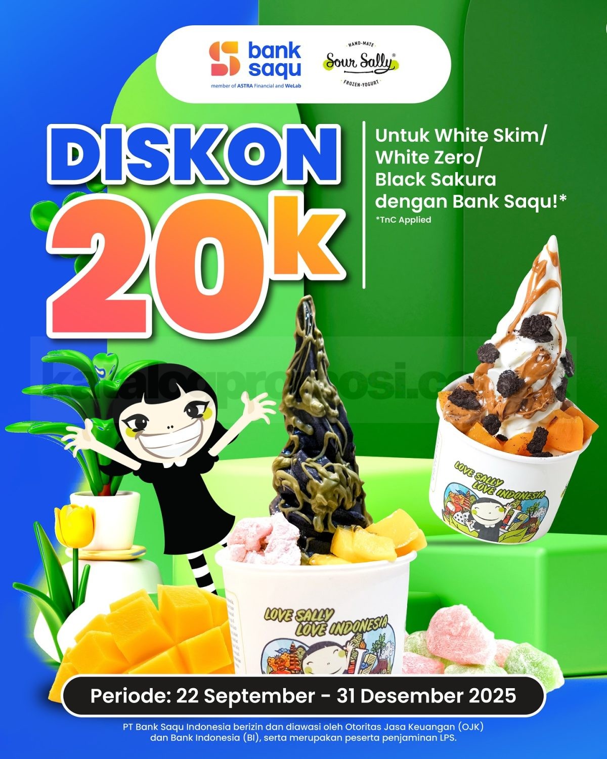 Dengan promo ini, kamu bisa nikmatin semua varian Sour Sally Large Cup cukup bayar lebih hemat. Cuma pake QRIS dari Bank Saqu, kamu langsung dapet potongan Rp20.000 per transaksi! ๐ Asyiknya lagi, promo ini berlaku dua kali tiap bulan, jadi kamu bisa ngadem dua kali lipat tanpa nyesel~ โจ