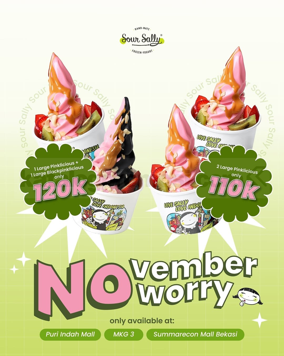 ✨ November No Worry! 💕 Biar hari-harimu makin manis tanpa khawatir, Promo Sour Sally November No Worry 2 Large Cup mulai Rp.110.000 hadir untuk menemani momen chill-mu dengan frozen yogurt favorit.