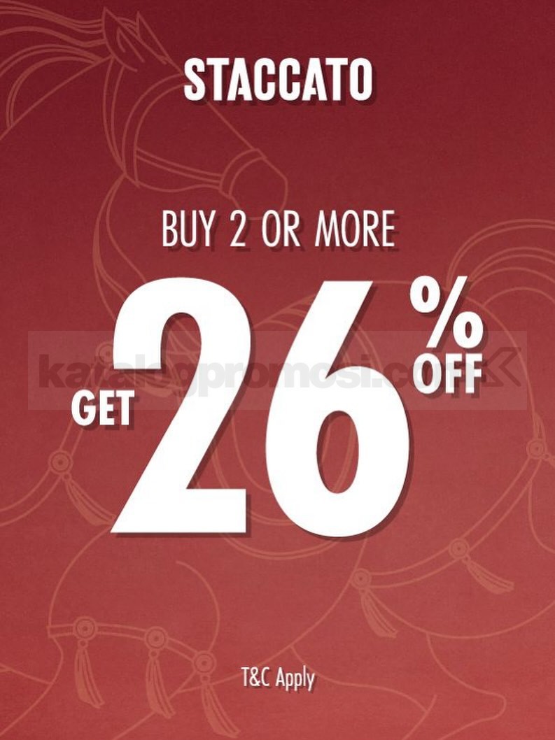 Promo STACCATO Lunar New Year Diskon hingga 50% untuk item pilihan dengan tambahan diskon 26% per item minimal belanja 2 item berlaku mulai 2 Februari 2026 – 17 Februari 2026