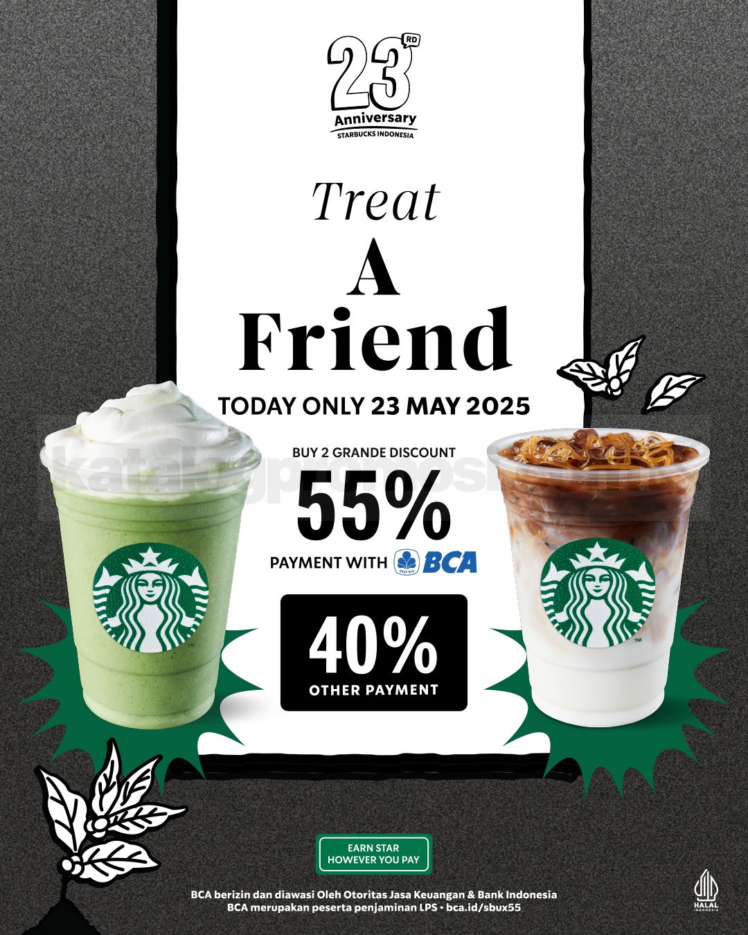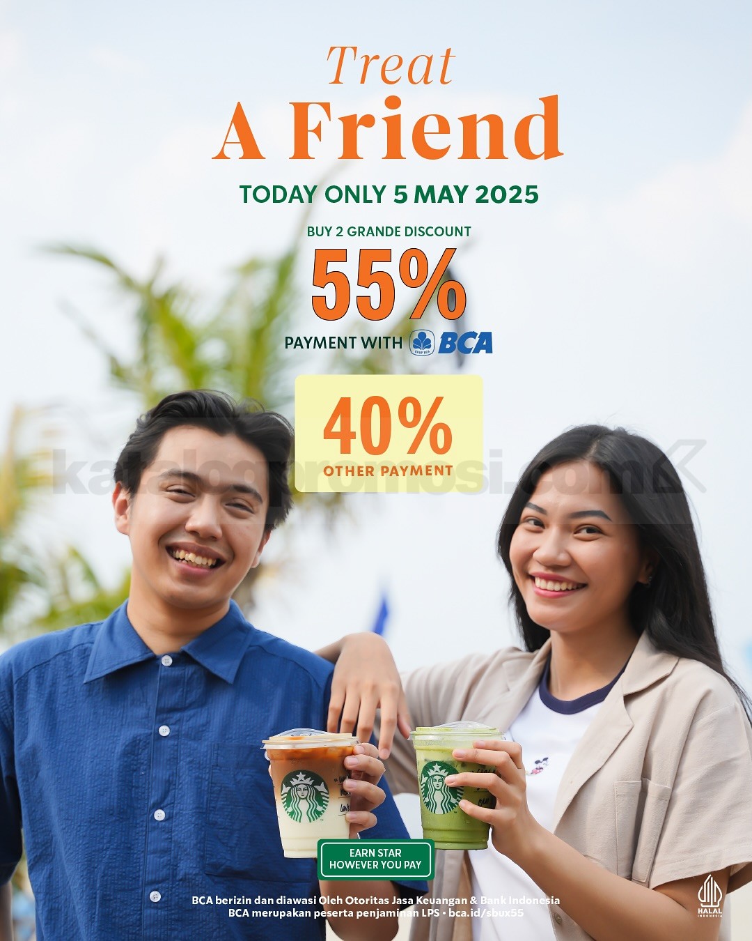 β’ Diskon 55% per minuman bila bayar pakai QRIS, BCA Mobile, myBCA, Sakuku, atau PayLater BCA