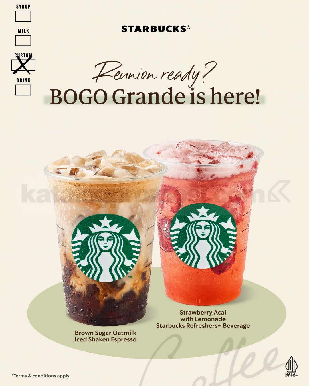 Boost energi dulu yuk? Redeem kupon Buy 1 Get 1 free grande beverage sama bestie kamu, cukup buat getting caffeinated seharian. Sekalian cek special price on selected merchandise ya. Jangan kelewatan kesempatan good dealnya 😍🛍️