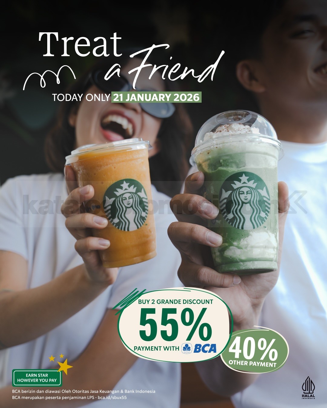 Promo Starbucks Treat A Friend 2 Grande Beverage Diskon 55% beli 2 minuman ukuran Grande dengan potongan harga menarik, berlaku mulai tanggal 21 Januari 2026.