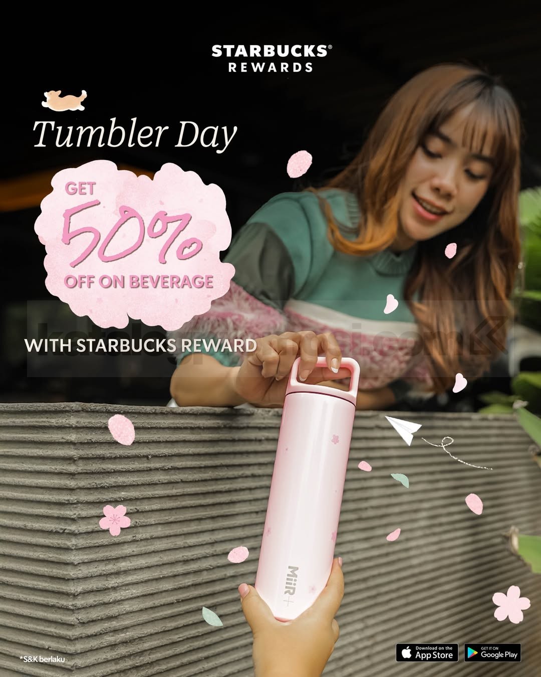 - Potongan 50% minuman hanya berlaku untuk Starbucks Rewards Member yang membawa tumbler Starbucks.