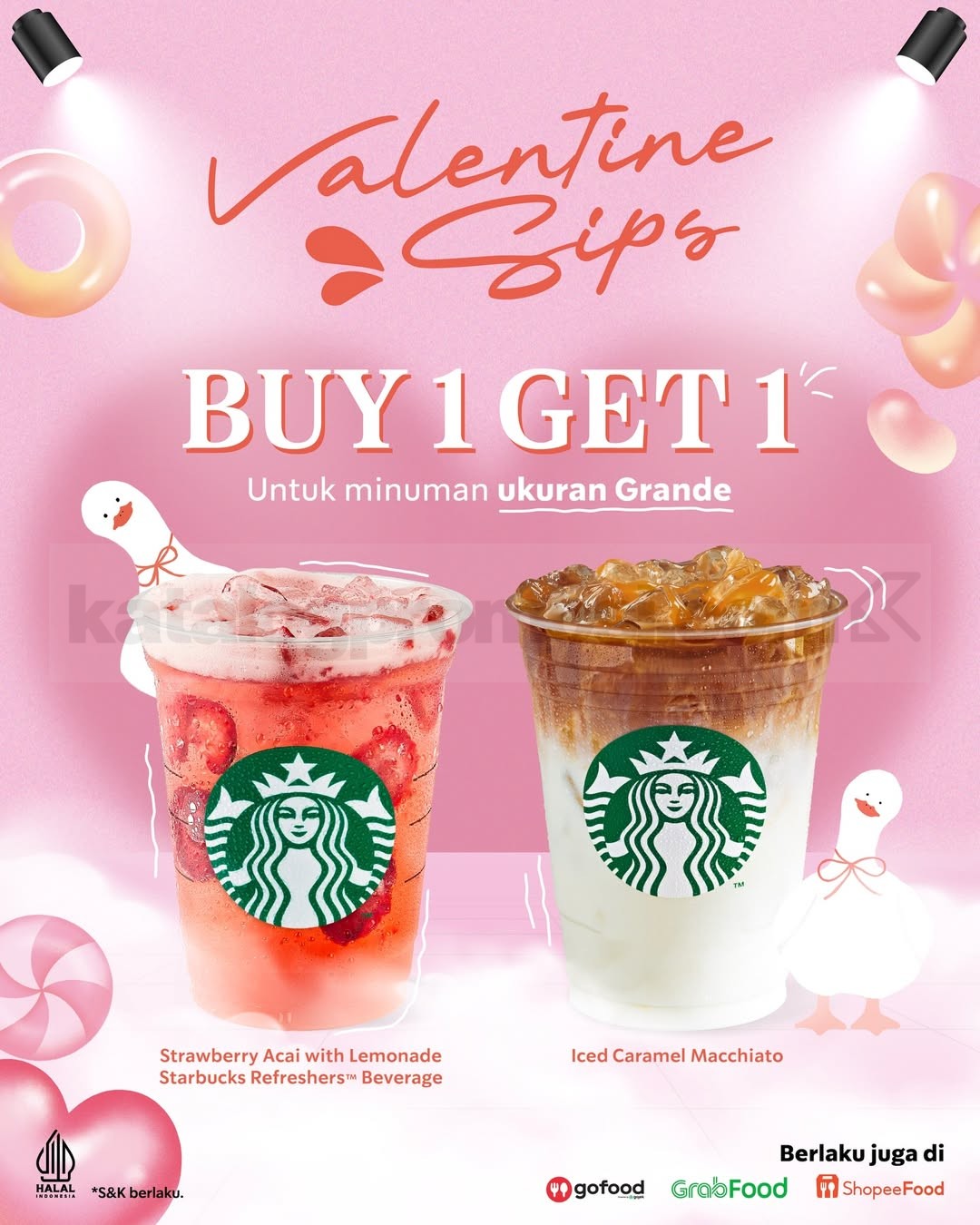 Promo Starbucks Valentine Sips Buy 1 Get 1 Free minuman Grande via outlet & delivery berlaku selama periode promo berlangsung di seluruh outlet