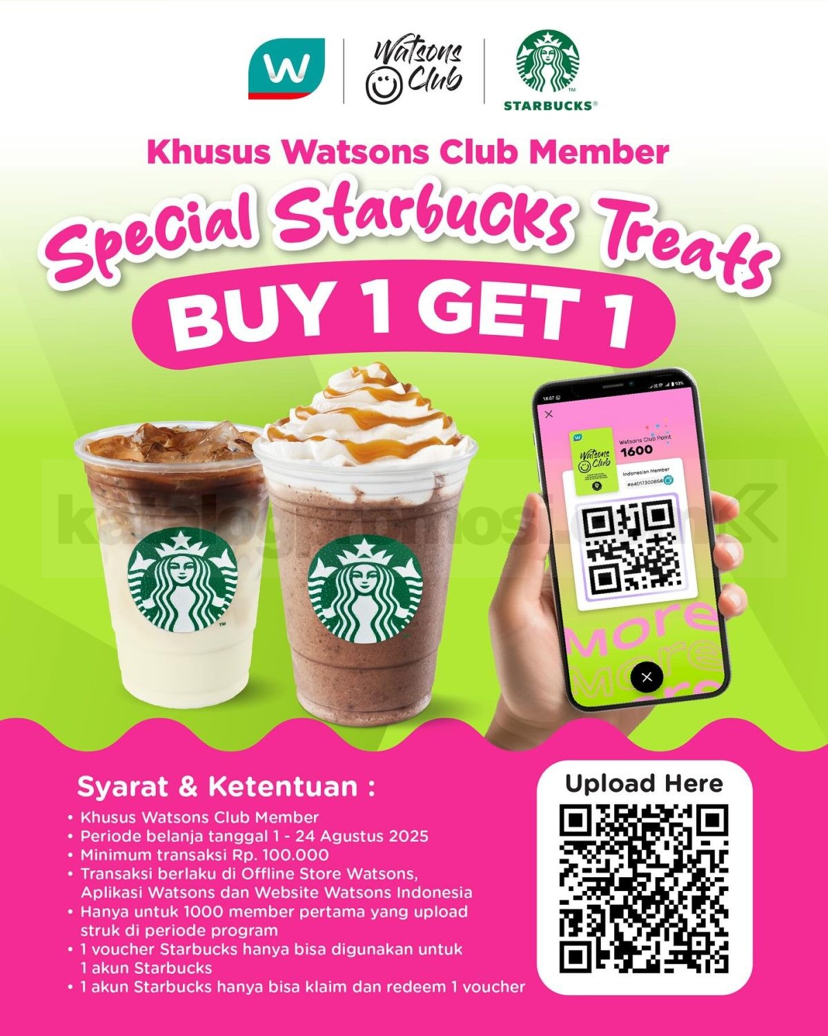Promo Starbucks x Watsons Club Member Buy 1 Get 1 berlaku 1โ24 Agustus 2025 untuk pembelian min. Rp100.000 di Watsons, berlaku bagi 1000 member pertama.