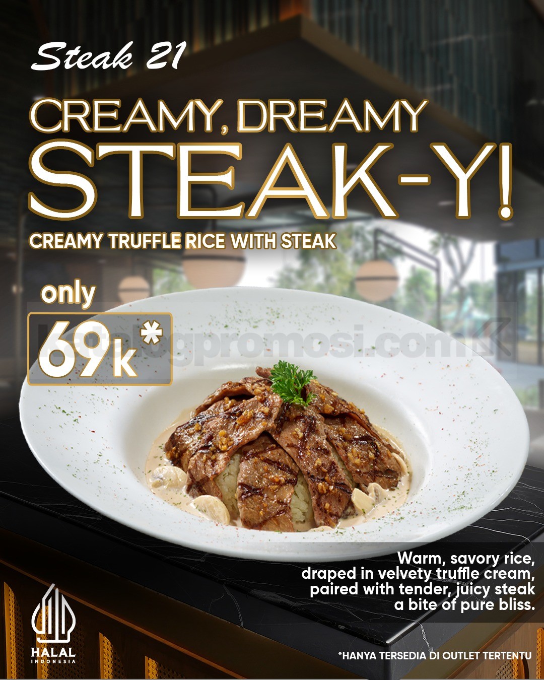 Promo Steak 21 Creamy Truffle Rice with Steak Rp. 69.000, hangat, creamy, truffle juicy + steak melt di mulut, berlaku selama persediaan ada di outlet tertentu.