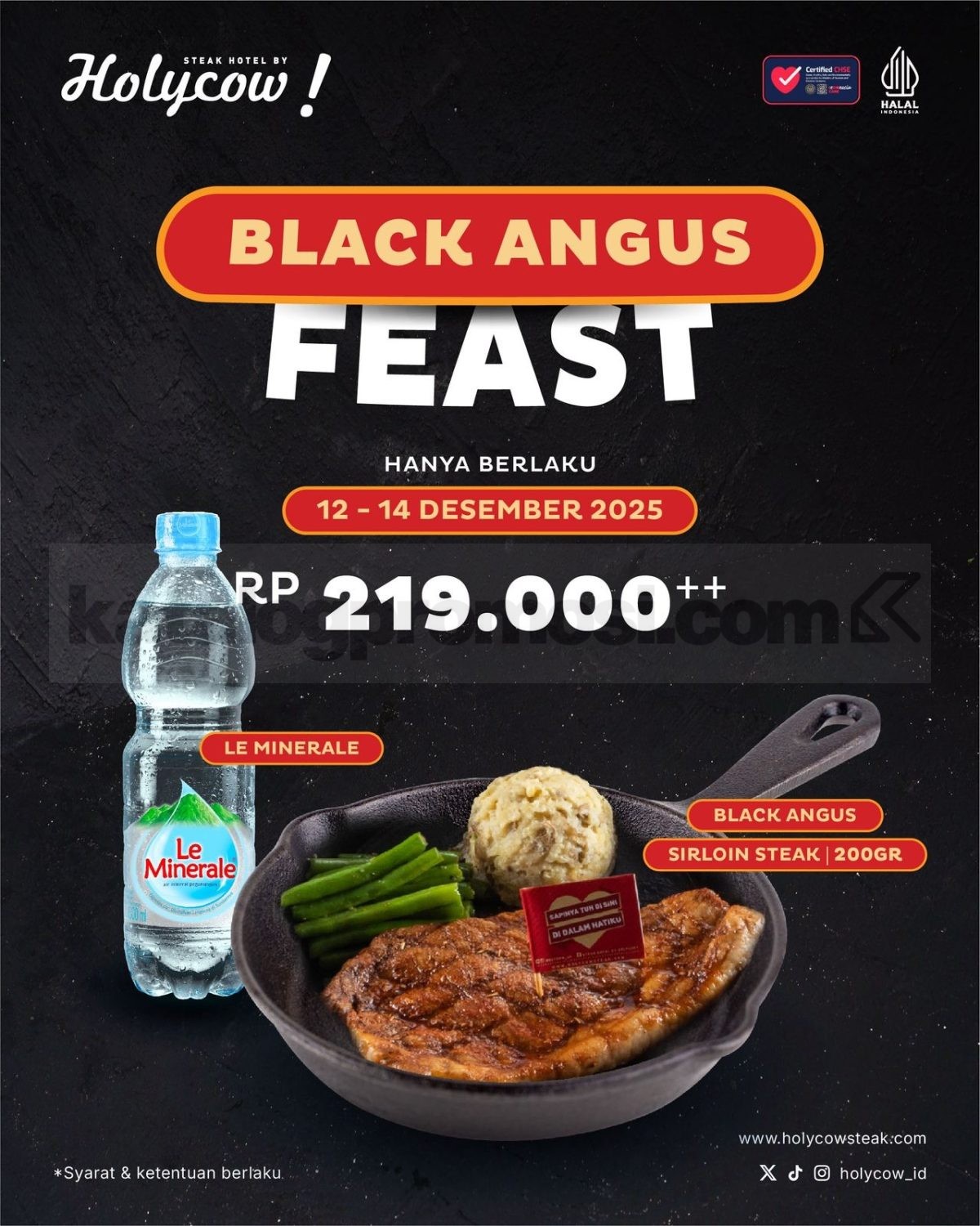 SEBELUM AKHIR TAHUN, WAKTUNYA SERBU PROMO MAKAN STEAK ENAK DI Steak Hotel by Holycow! 🥳 Selama tiga hari pada 12–14 Desember 2025, Holycow! lagi buka paket Black Angus Feast berisi 1 Black Angus Sirloin Steak 200 gr + 1 Le Minerale dengan harga Rp. 219.000++. Promo ini khusus dine-in, berlaku kelipatan, dan bisa kamu nikmati di semua TKP non-bandara.