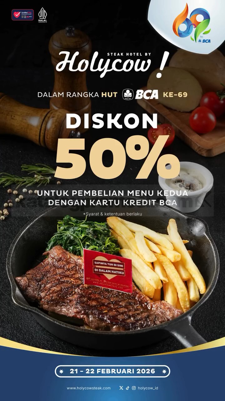 Nikmati diskon 50% untuk menu kedua Steak Ala Carte di Steak Hotel by HOLYCOW!. Promo berlaku 21 – 22 Februari 2026 untuk transaksi dine-in menggunakan Kartu Kredit BCA.