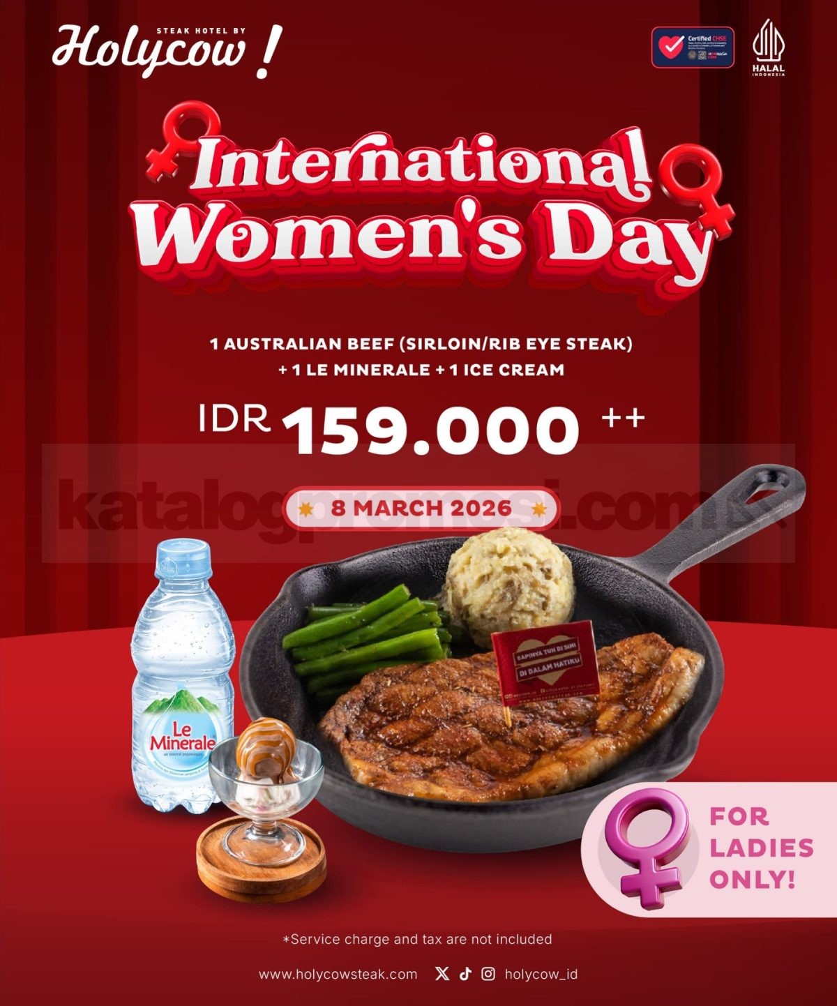 Promo ini berlangsung khusus satu hari pada tanggal 8 Maret 2026 dan tersedia untuk transaksi dine in di outlet Steak Hotel by HOLYCOW!. Promo berlaku khusus bagi pengunjung perempuan yang ingin menikmati paket International Women’s Day di restoran.