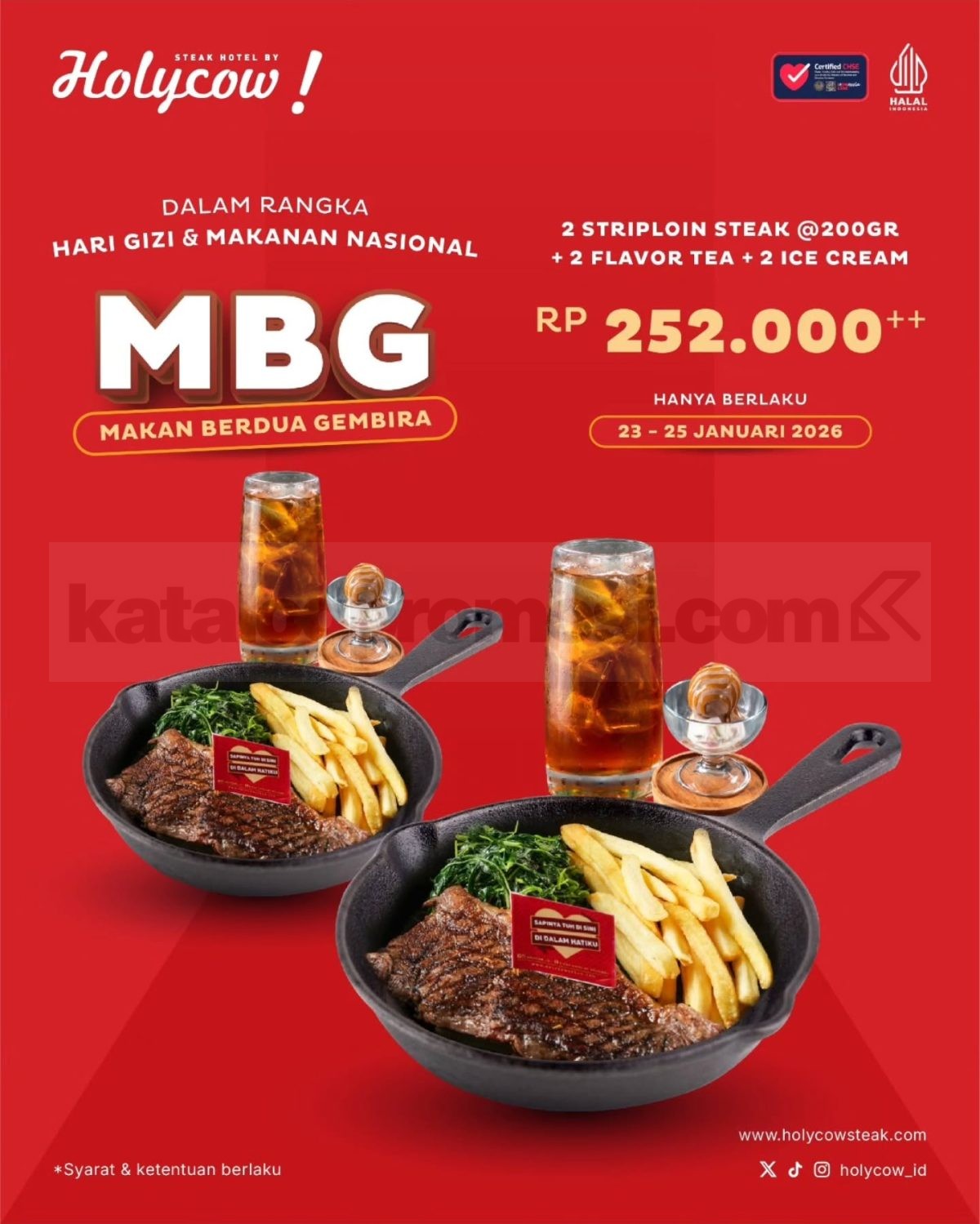 Promo Steak Hotel by HOLYCOW! MBG Berdua Rp. 252.000++ berlaku 23 – 25 Januari 2026 khusus dine-in di outlet non bandara.