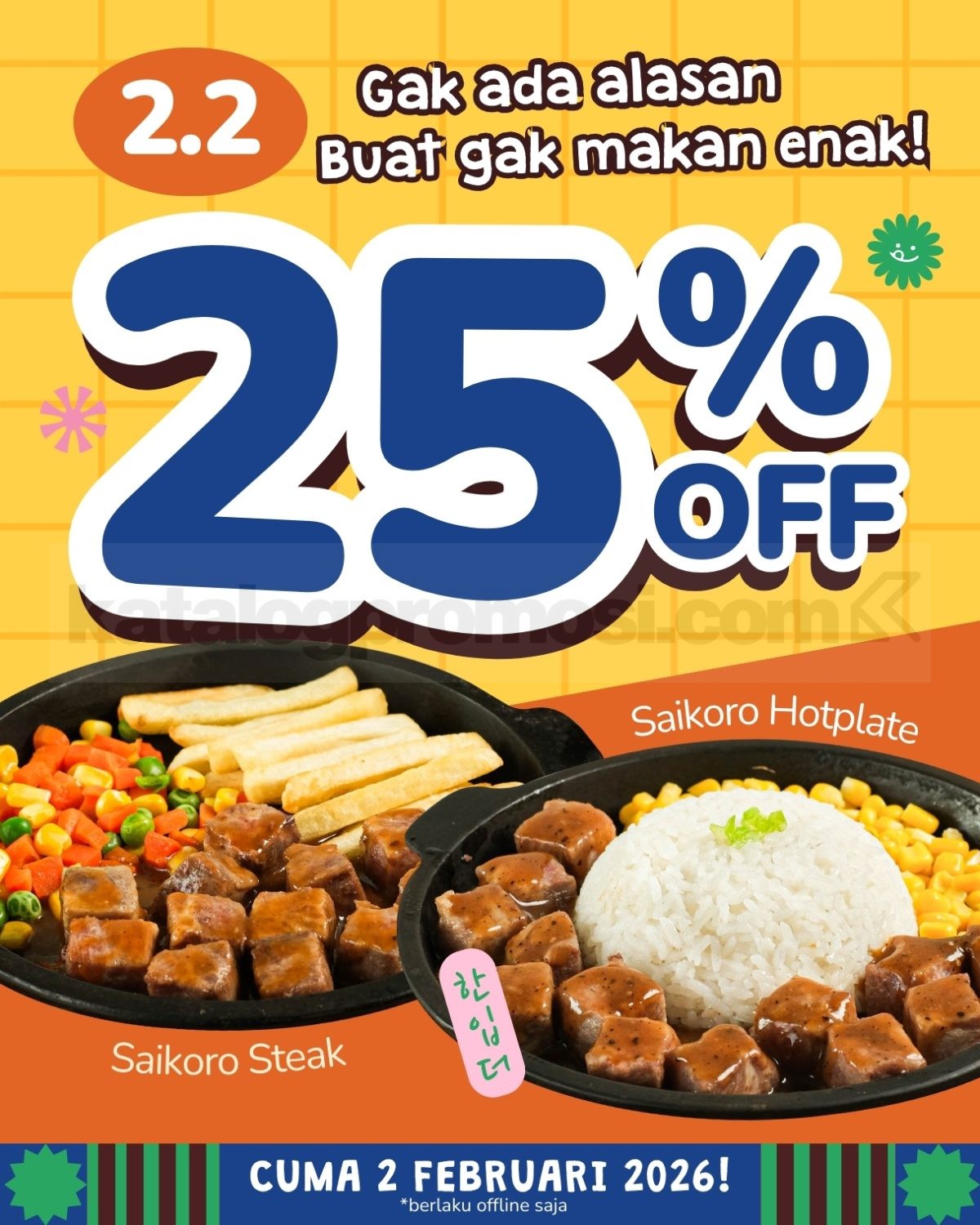Promo Steak With U 2.2 Saikoro Steak & Hotplate Diskon 25% berlaku pada tanggal 2 Februari 2026.