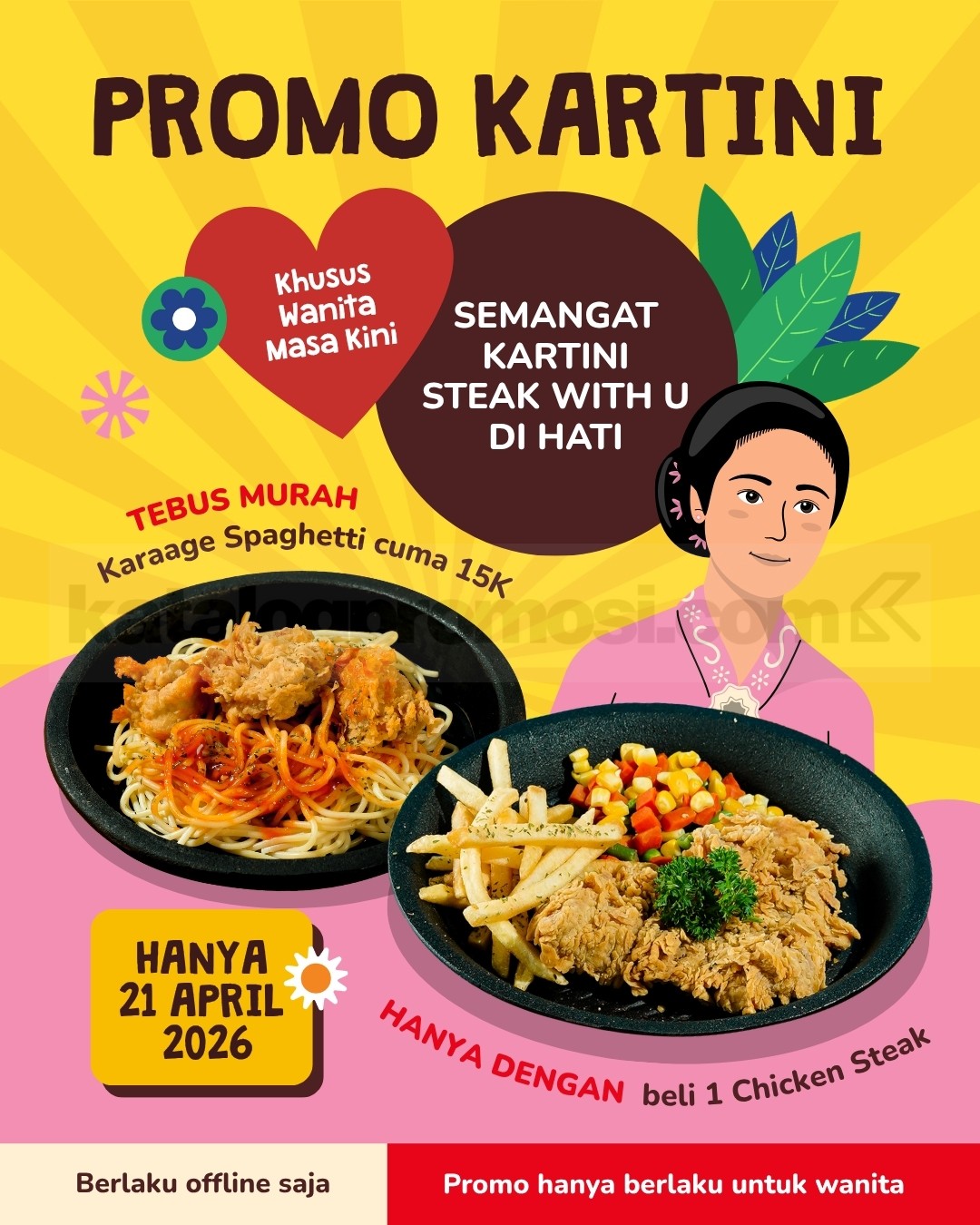 Promo Steak With U Hari Kartini Karaage Spaghetti Rp.15.000 bisa digunakan setelah membeli 1 Chicken Steak lalu menebus Karaage Spaghetti harga Rp.15.000 pada tanggal 21 April 2026 melalui pembelian langsung di outlet yang ikut program.