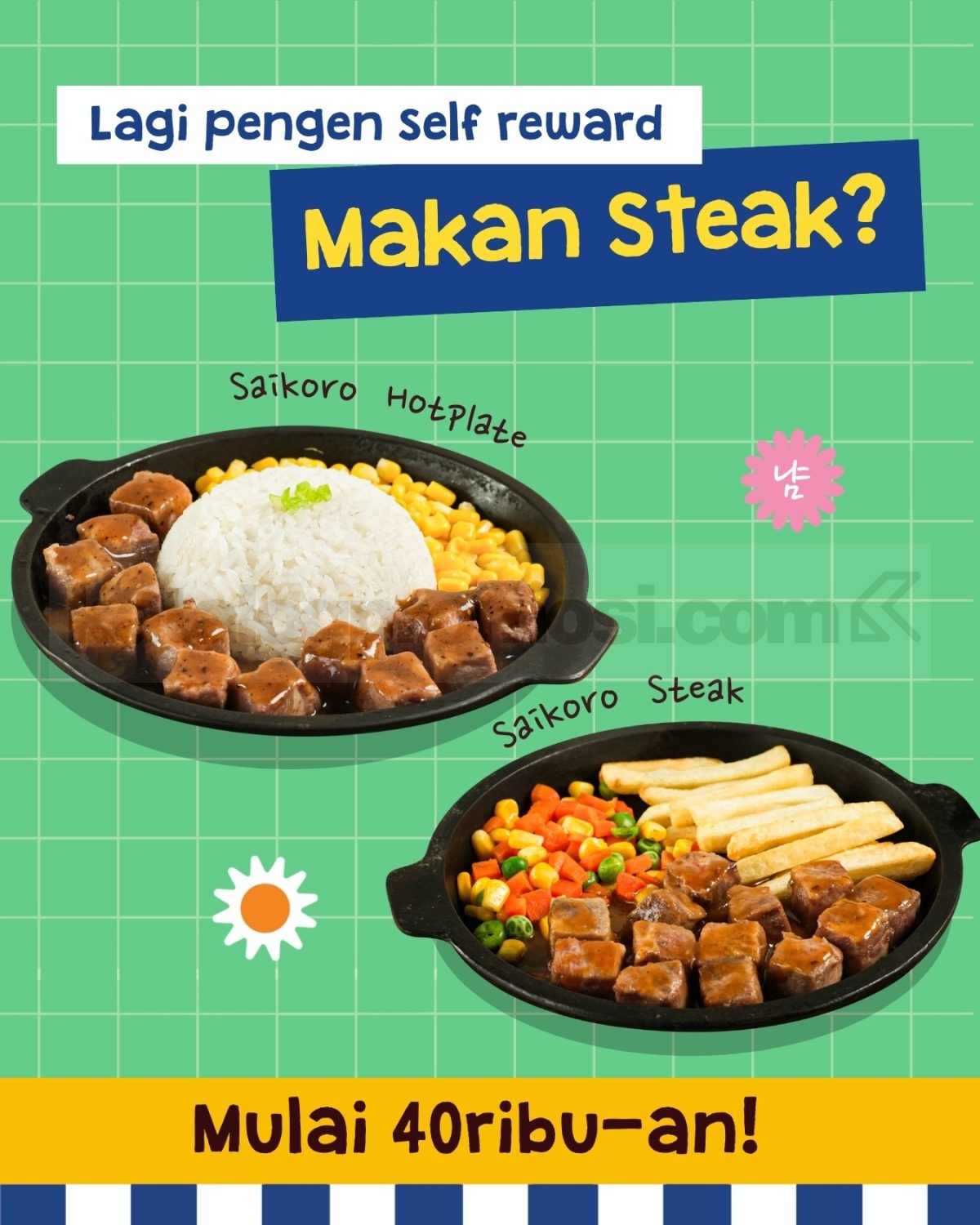 Menu steak seperti Saikoro Hotplate, Saikoro Steak, Chicken Steak, Beef Steak, Bestie Steak, serta minuman Pinkiss Soda, Melon Soda, dan Yakult Soda.