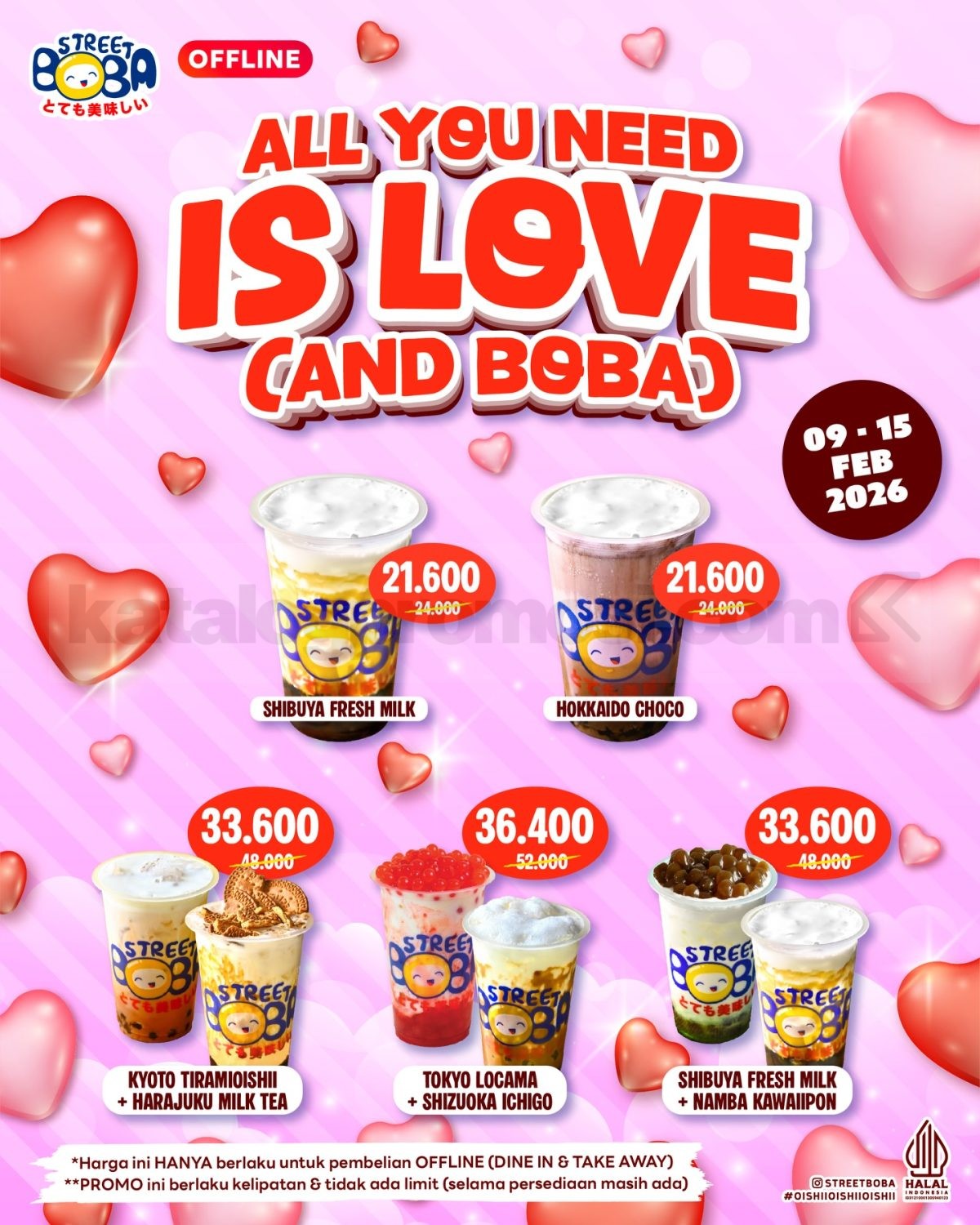 Pilihan menu yang termasuk dalam Promo Street Boba All You Need Is Love antara lain: