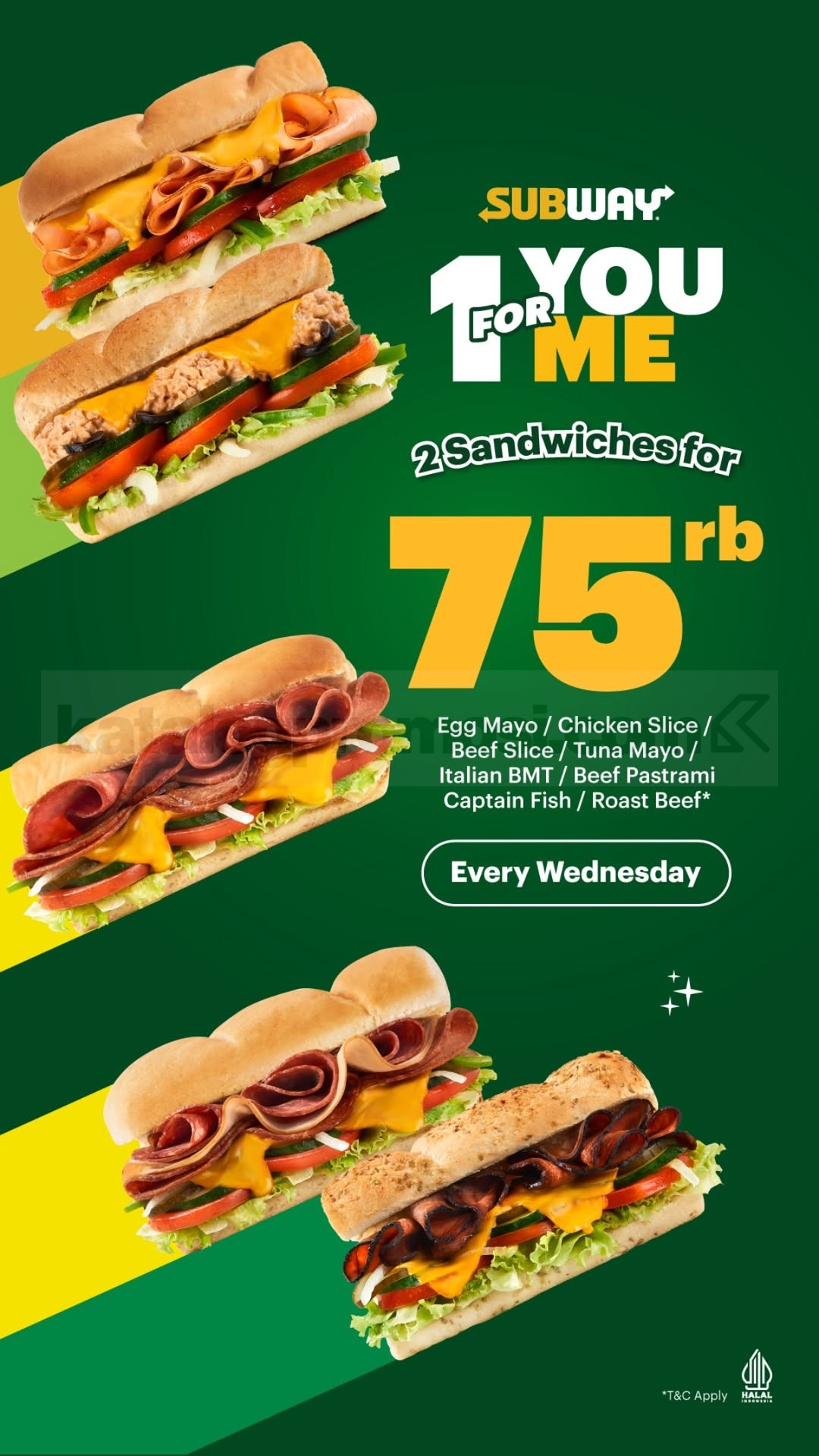 Promo pembelian dua sandwich Subway dengan harga Rp. 75.000 yang berlaku setiap hari Rabu.