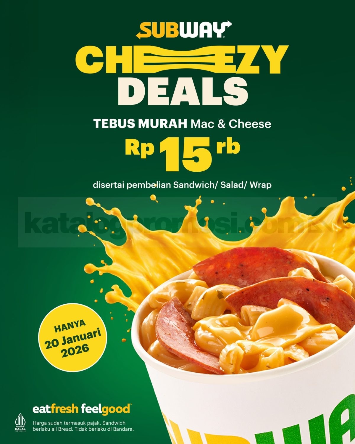 Promo SUBWAY Cheezy Deals Mac & Cheese Rp. 15.000 berlaku hanya di tanggal 20 Januari 2026 dengan pembelian sandwich, salad, atau wrap di seluruh outlet tertentu.