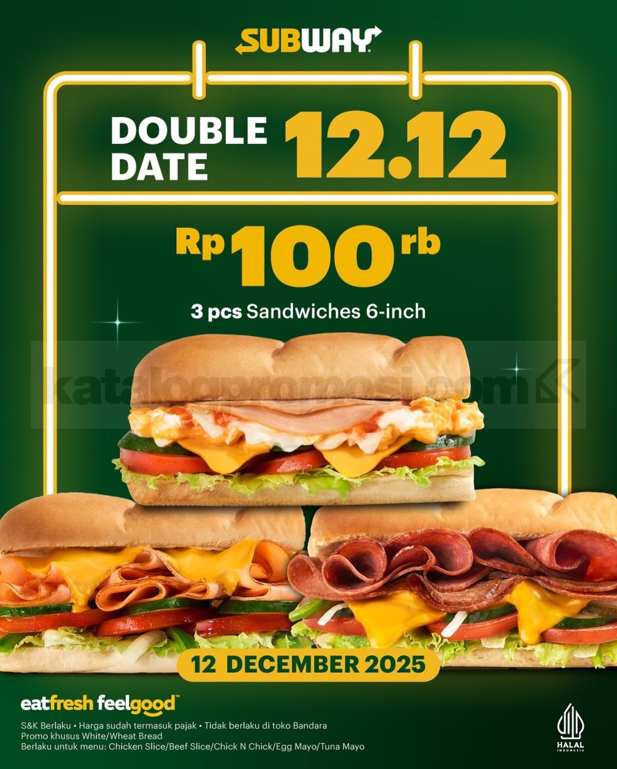 Promo Subway Double Date 12.12 3 Sandwich Rp. 100.000 berlaku 12 Desember 2025 untuk pilihan menu Chicken Slice, Beef Slice, Chick N Chick, Egg Mayo, dan Tuna Mayo di outlet tertentu.