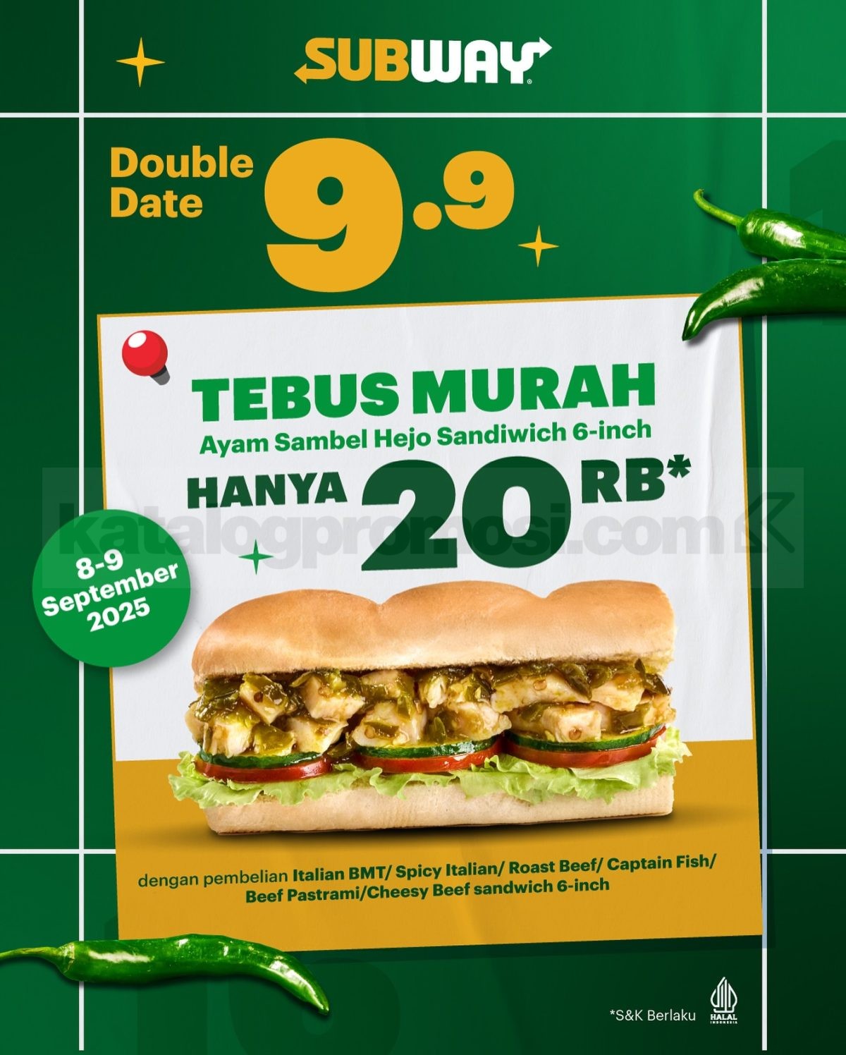 Promo Subway Double Date 9.9, Tebus Murah Ayam Sambel Hejo 6-inch cuma Rp20.000 di tanggal 8–9 September 2025.