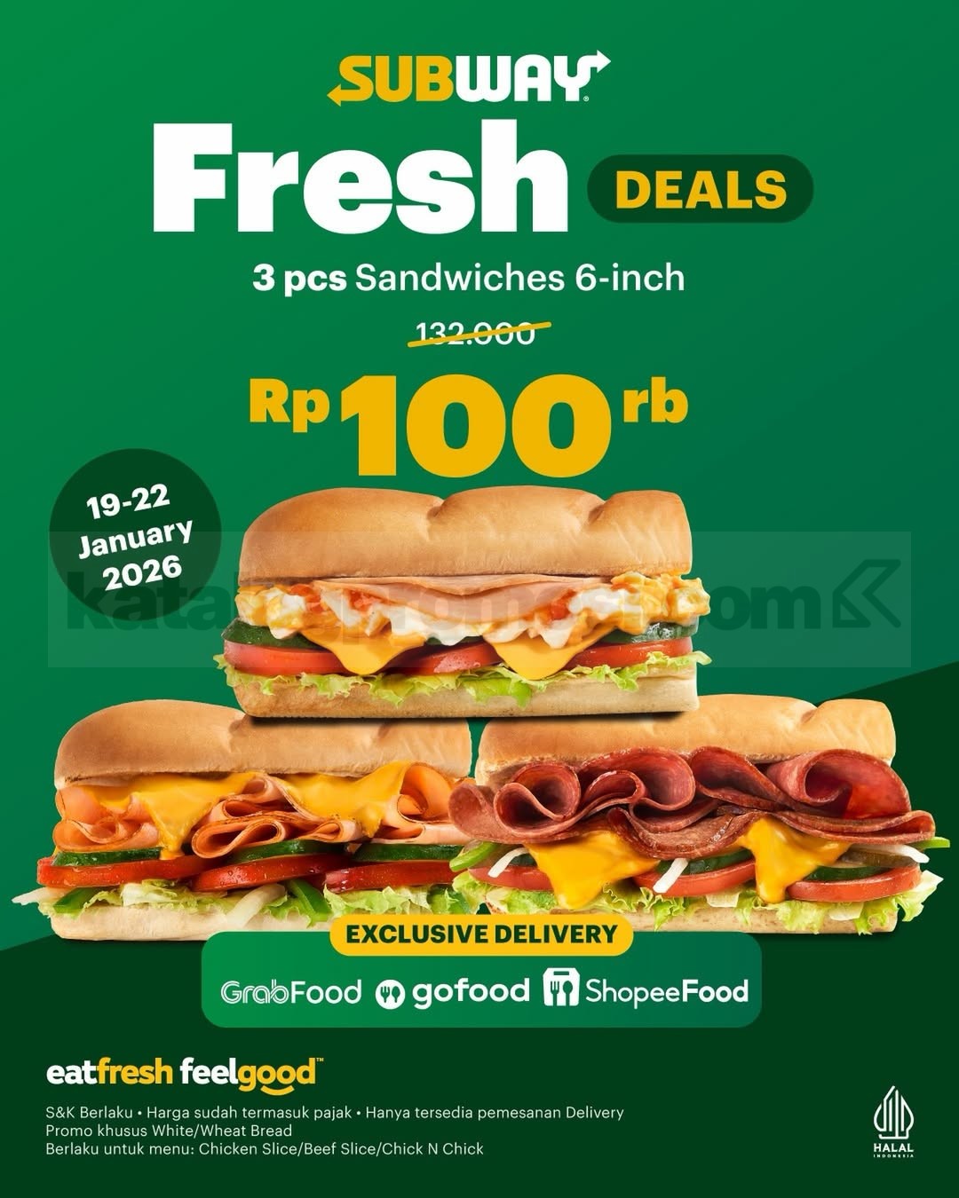 Promo Subway Fresh Deals 3 Sandwich 6-inch Rp. 100.000 dengan pilihan Chicken Slice, Beef Slice, Chick N Chick via delivery online berlaku mulai tanggal 19 Januari 2026 – 22 Januari 2026
