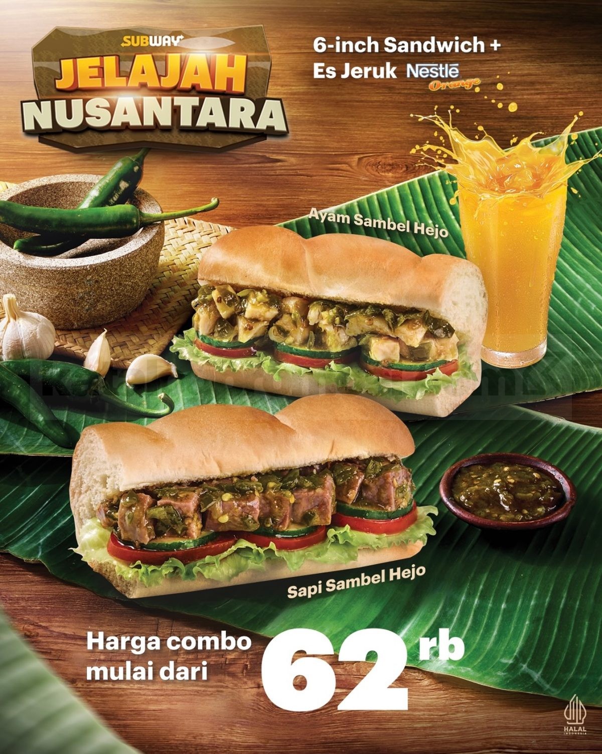 Promo SUBWAY Jelajah Nusantara Ayam dan Sapi Sambal Hejo berlaku mulai tanggal 1โ31 Agustus 2025 dengan sensasi sambal cabe hijau segar, tersedia juga dalam paket combo 6-inch sandwich + Es Jeruk Nestle mulai Rp. 62.000.
