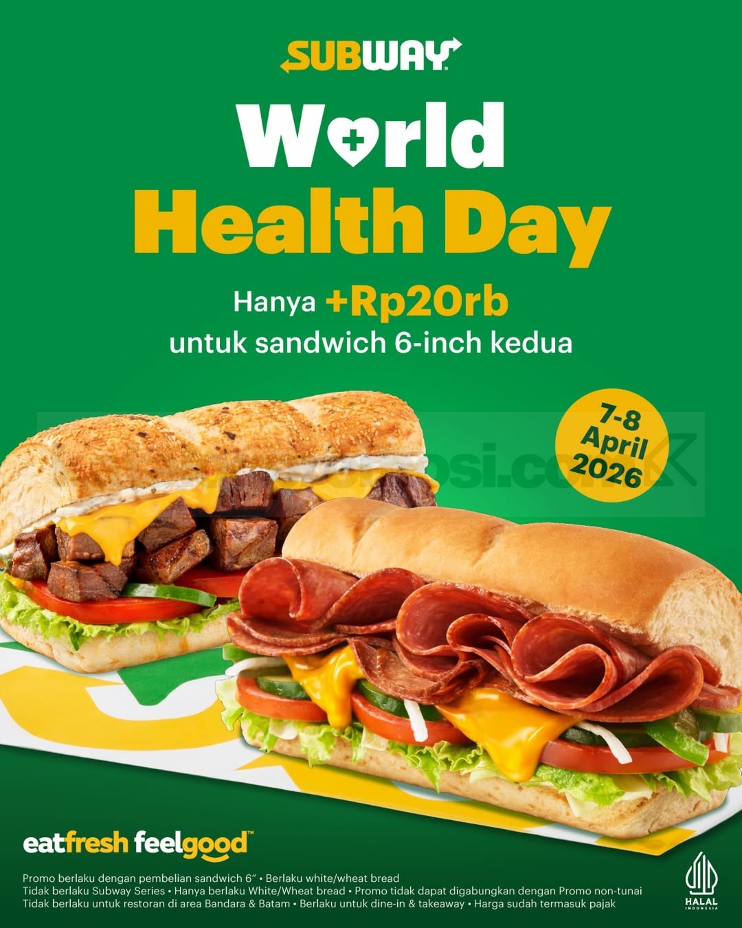 Promo Subway World Health Day Sandwich Kedua Rp. 20.000 dapat 2 sandwich berlaku mulai tanggal 7 April 2026 – 8 April 2026 di lokasi tertentu