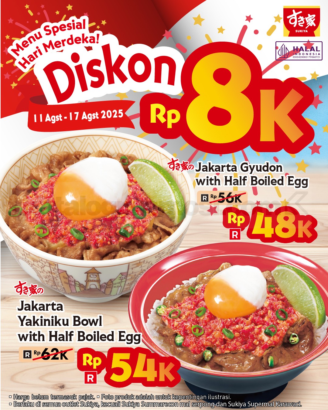 Rayakan kemerdekaan dengan cara paling enak — makan! 🎉 Mulai 11–17 Agustus 2025, Promo Sukiya Menu Spesial Hari Merdeka hadir dengan potongan Rp8.000 untuk menu andalan yang bikin kenyang dan happy. Pilihan utamanya ada Jakarta Gyudon & Jakarta Yakiniku Bowl with Half Boiled Egg mulai dari 48K, pas banget buat makan siang atau dinner bareng teman.