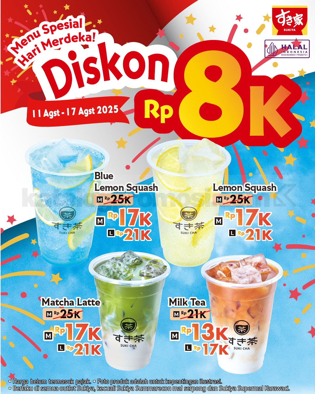 Nggak cuma makanan, ada juga minuman segar mulai 13K seperti Blue Lemon Squash, Lemon Squash, Matcha Latte, dan Milk Tea yang bikin suasana makin fresh. 🍚🥤 Berlaku di semua outlet Sukiya* biar semua orang bisa ikut rayakan kemerdekaan dengan rasa yang juara. (*Kecuali Sukiya Summarecon Mall Serpong & Sukiya Supermal Karawaci)