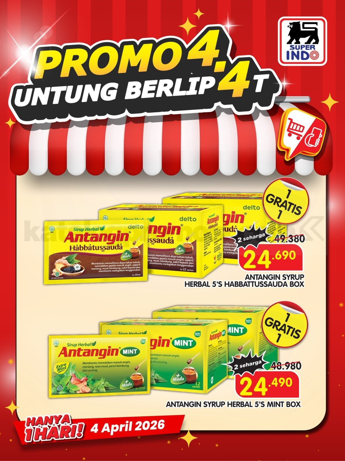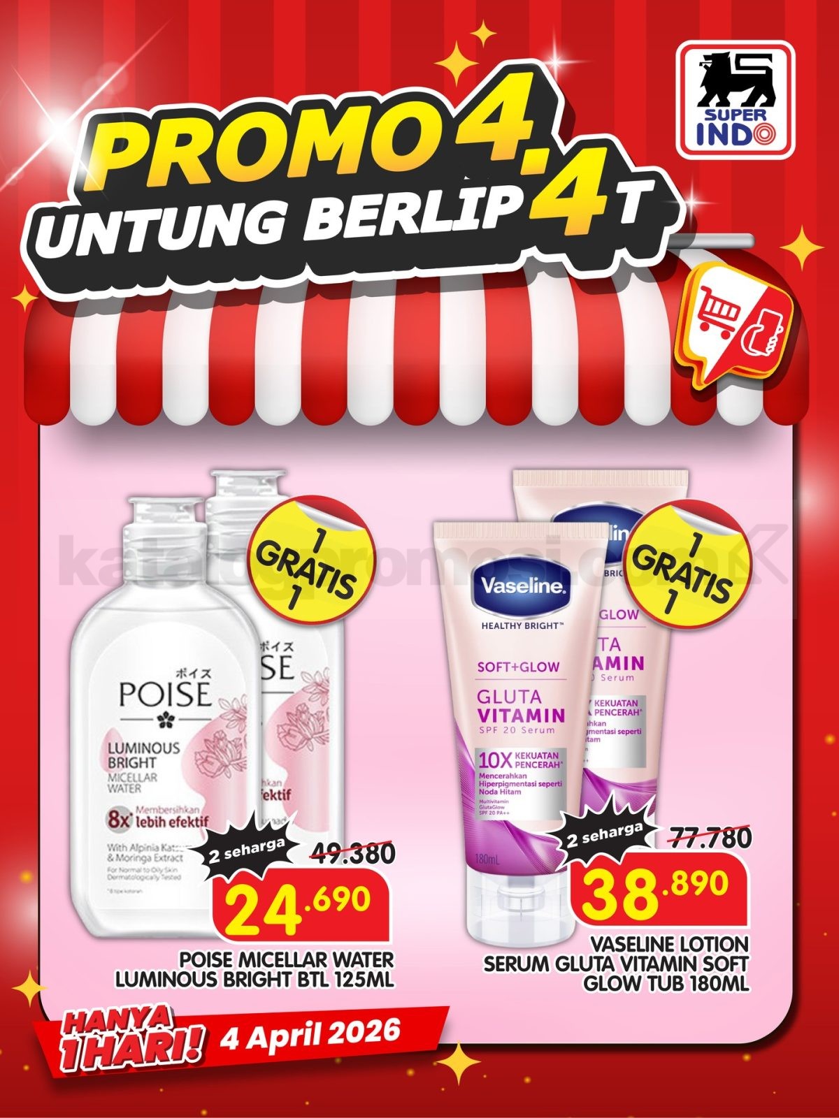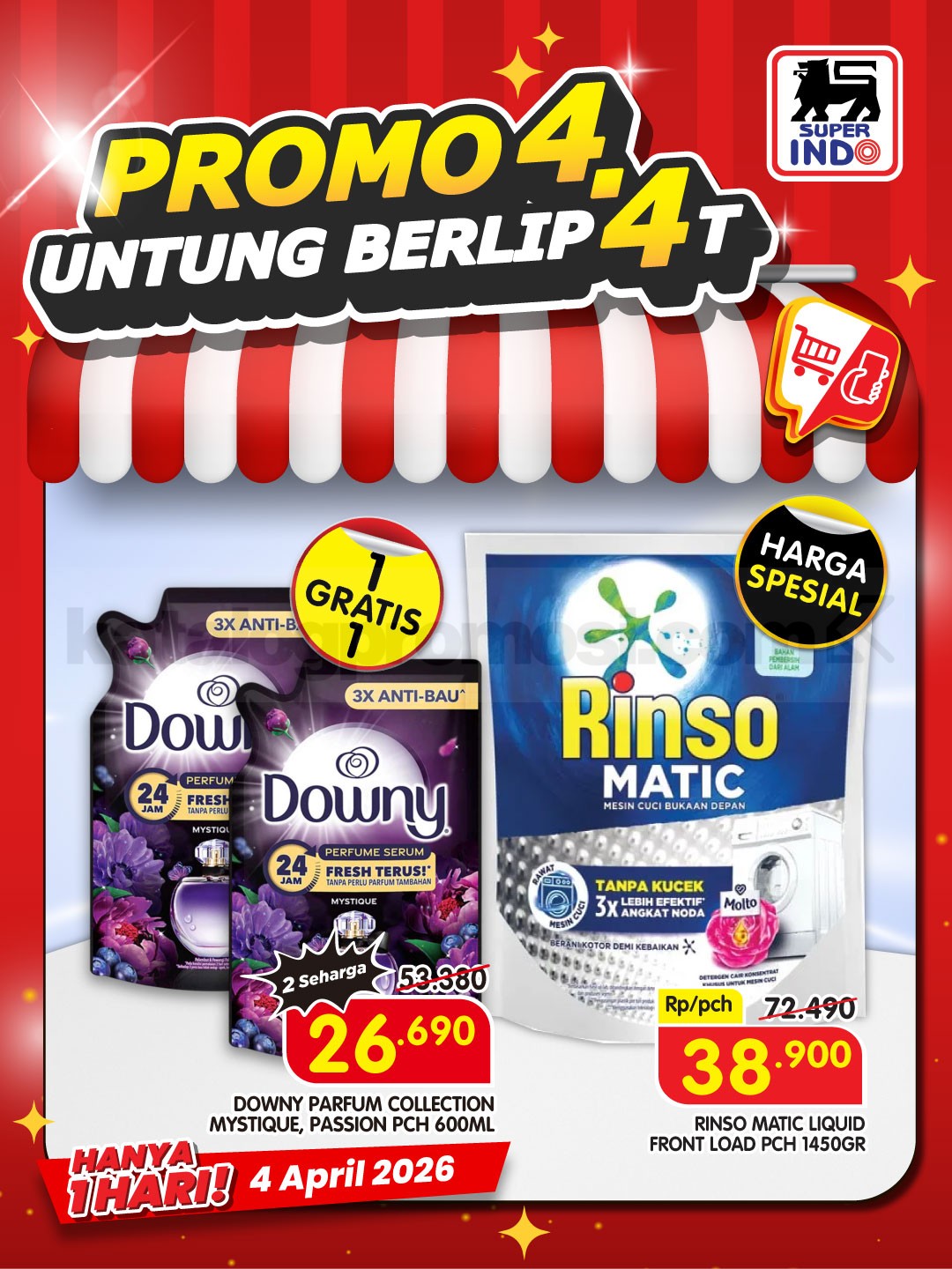 Promo Super Indo 4.4 Flash Sale Produk Hemat Spesial hanya 1 hari, tanggal 4 April 2026 untuk pembelian di toko Super Indo dan MySuperIndo dengan berbagai produk kebutuhan harian harga khusus.