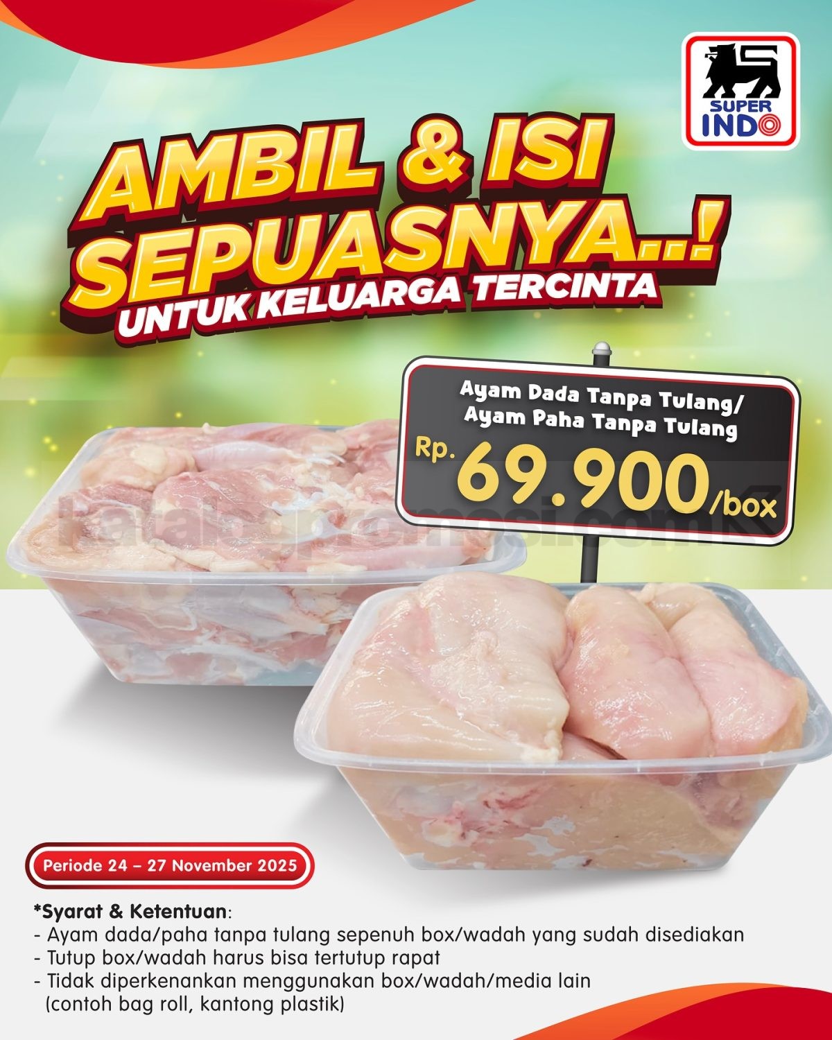 Promo Super Indo Ambil & Isi Sepuasnya Ayam Rp. 69.900/box dengan sistem isi box hingga penuh, berlaku 24โ27 November 2025 di seluruh outlet.