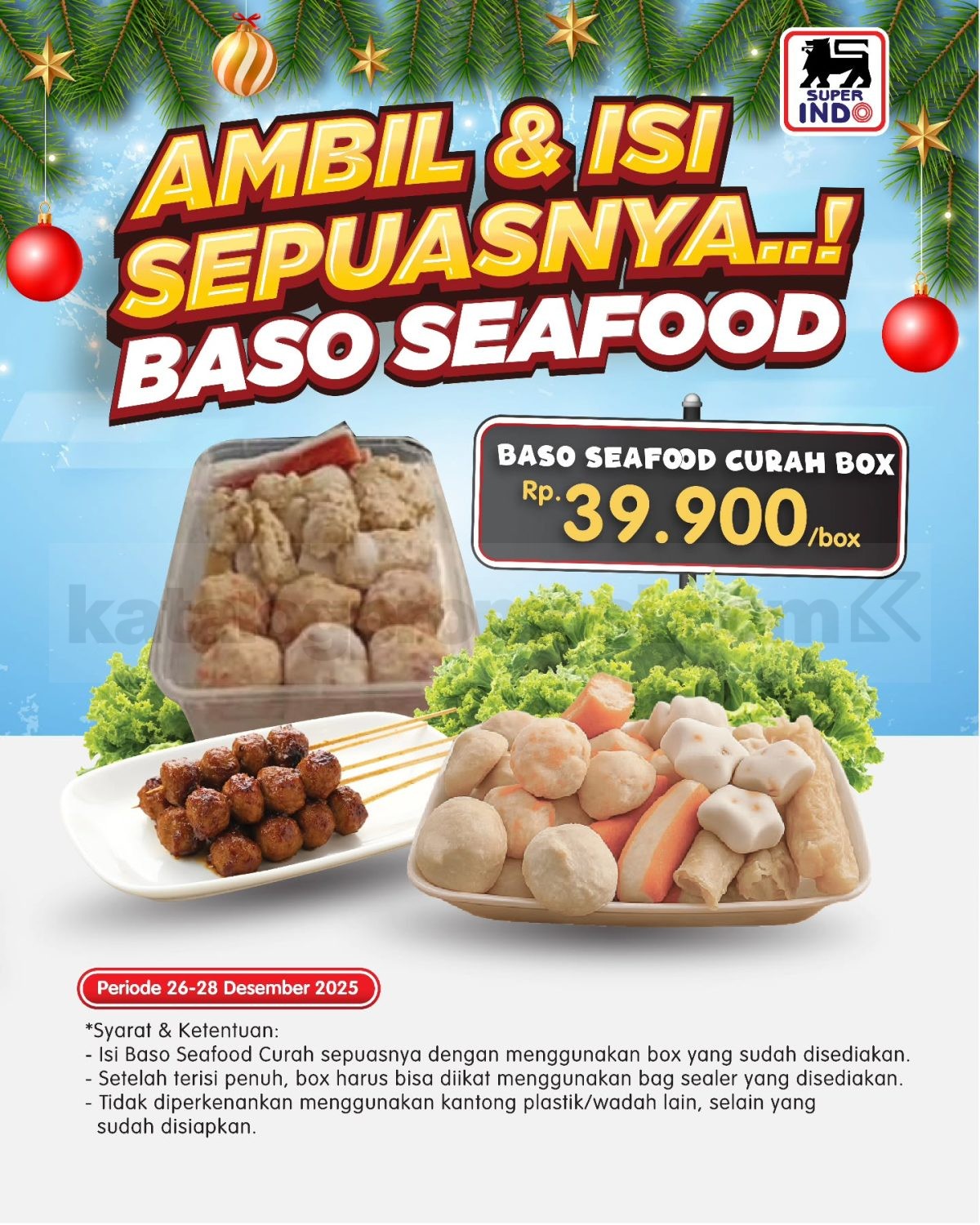 Promo Super Indo Ambil & Isi Sepuasnya Baso Seafood Rp. 39.900 berlaku tanggal 26 Desember 2025 – 28 Desember 2025 di store Super Indo tertentu.