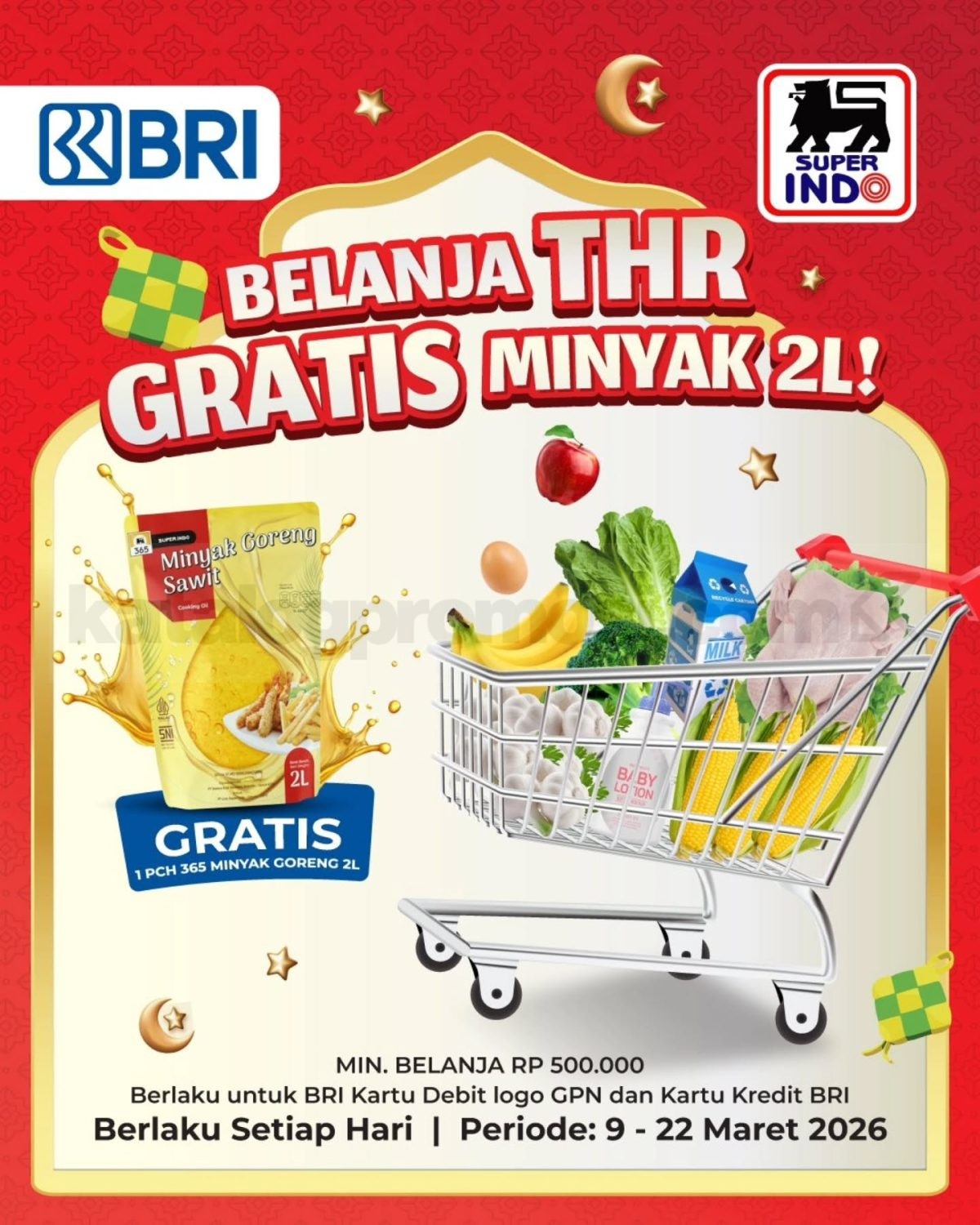 Promo Super Indo BRI Ramadan Belanja THR Gratis Minyak 2L periode 9 – 22 Maret 2026 untuk transaksi min. Rp. 500.000 menggunakan kartu debit GPN atau kartu kredit BRI di Super Indo.