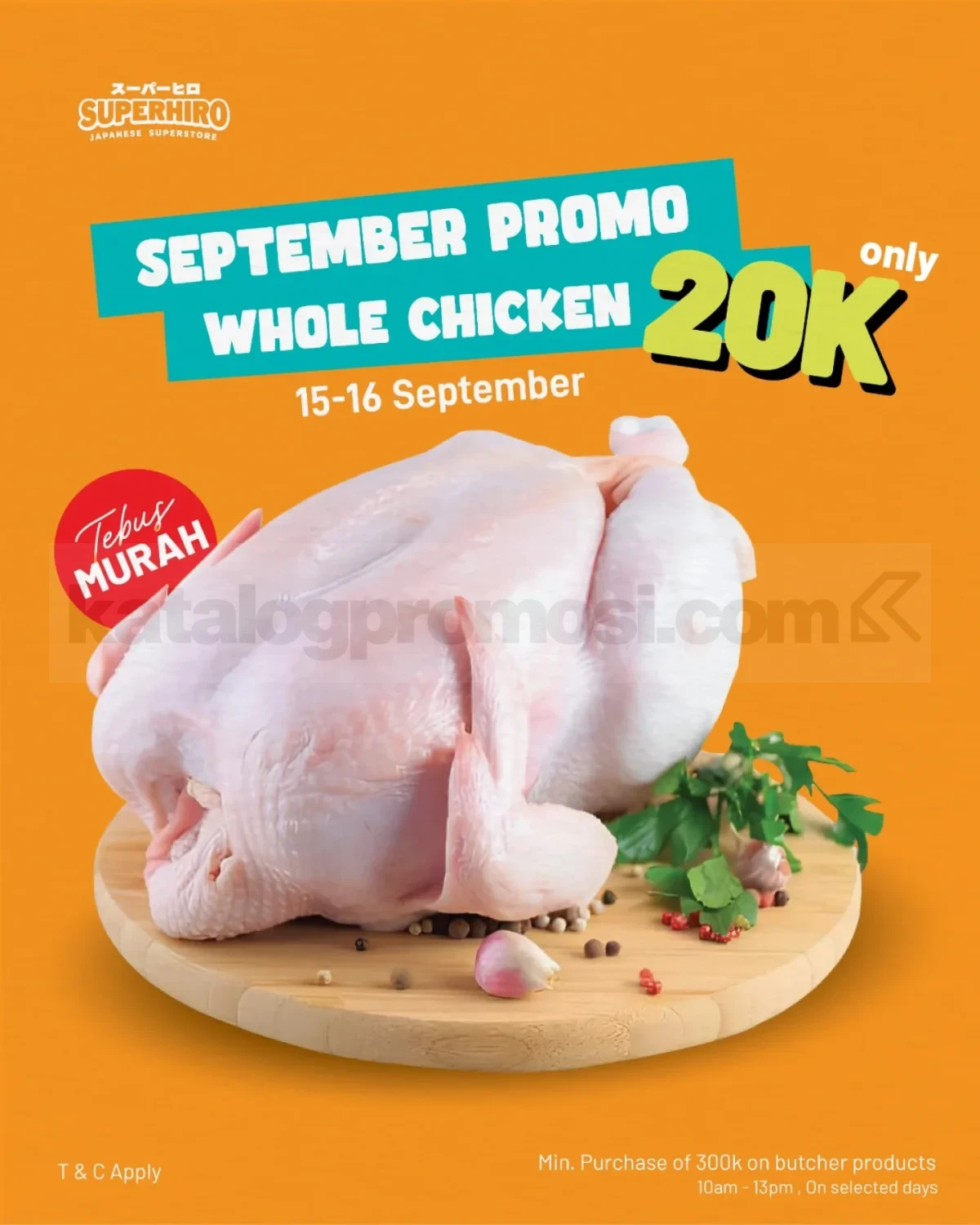 Promo SUPERHIRO tebus murah whole chicken Rp20 ribu berlaku 15 – 16 September 2025 dengan minimal belanja Rp300 ribu produk fresh butcher pukul 10.00 – 13.00 WIB.