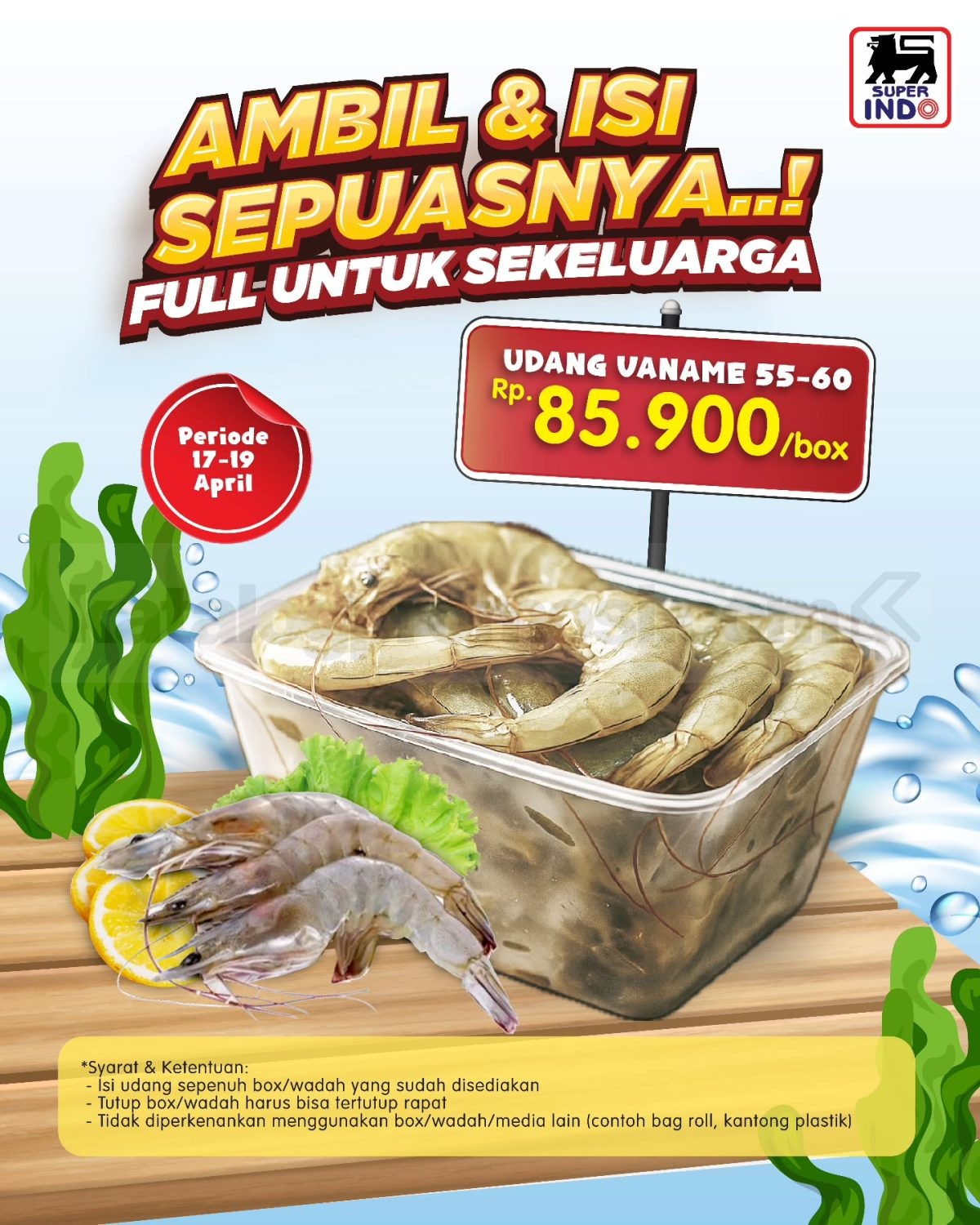 Promo Super Indo Ambil & Isi Sepuasnya Udang Vaname Rp 85.900 periode 17 – 19 April 2026 untuk pengisian box udang vaname 55–60 di store Super Indo.