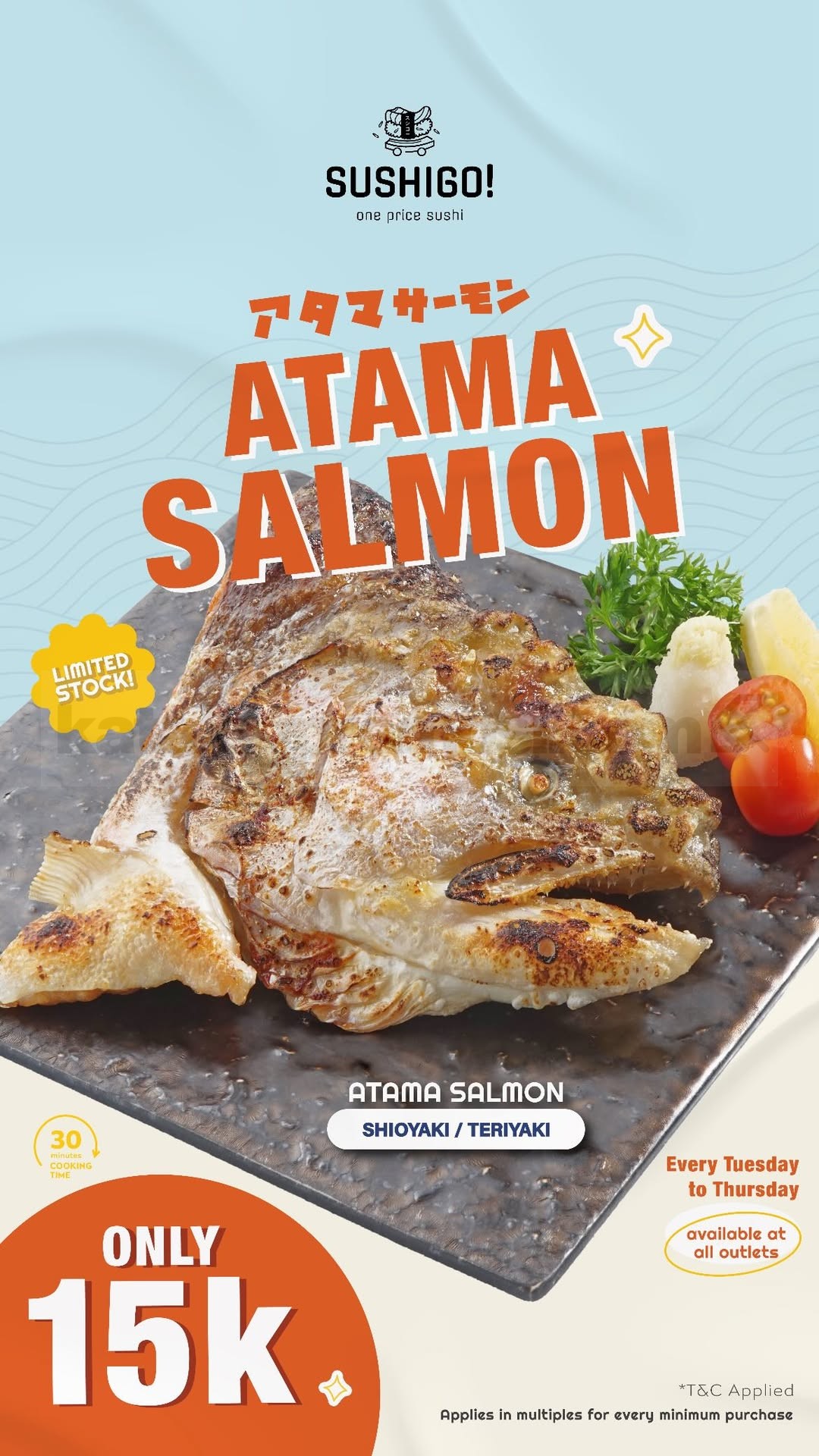 - Harga Rp. 15.000 berlaku untuk menu Atama Salmon Shioyaki dan Atama Salmon Teriyaki.