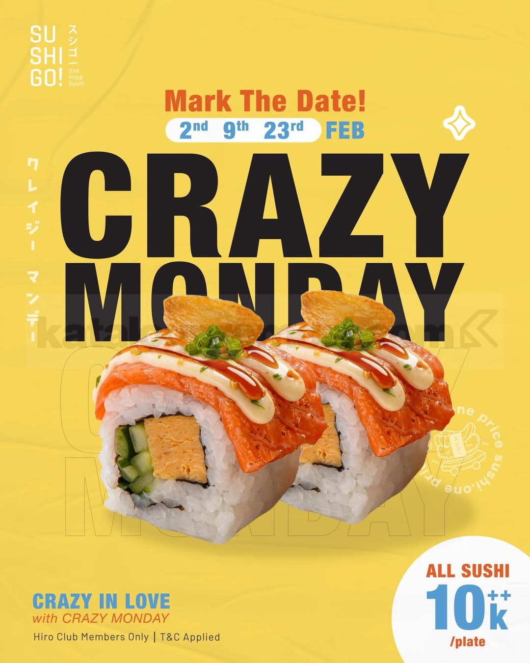 Promo Sushi Go! Crazy Monday All Sushi Rp. 10.000++ nikmati semua sushi per plate harga spesial, dine in member Hiro Club berlaku 2 Februari 2026 – 23 Februari 2026 di seluruh outlet